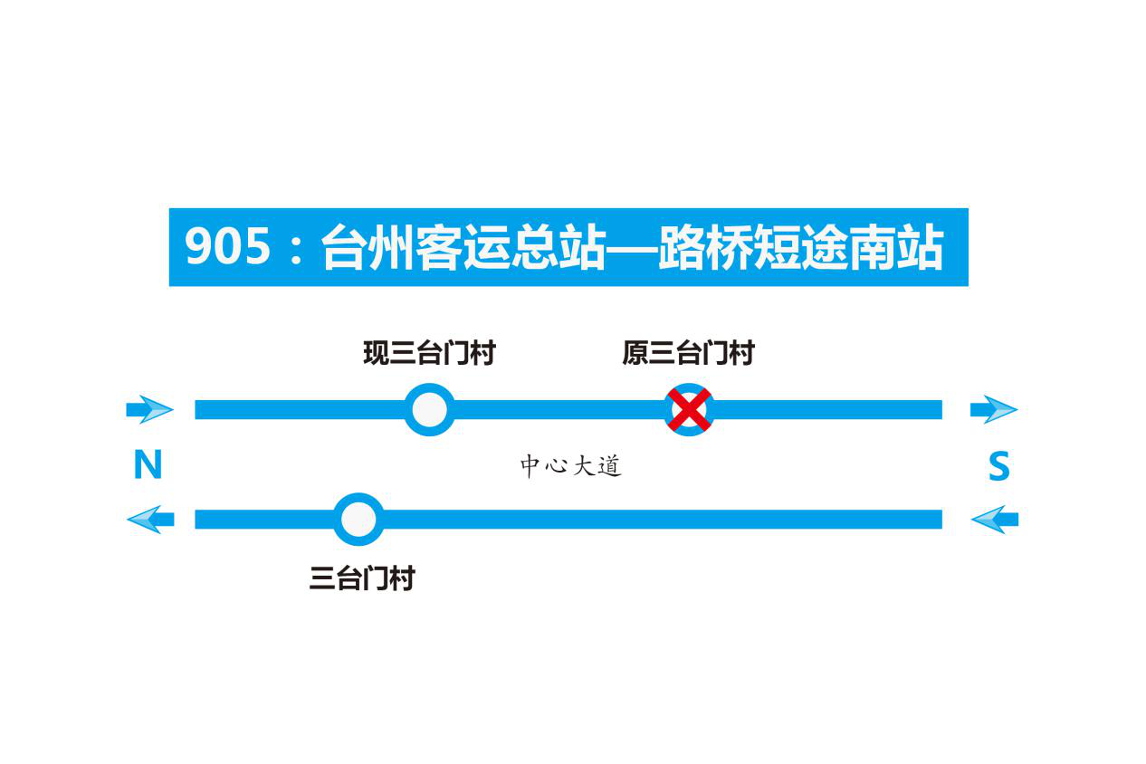 因S1线轻轨路线“开发大道站”已纳入椒江区规划的4个站点之一,目前开发大道与中心大道交叉口正处于施工建设状态,正在运营的905路公交车由客运总站开往路桥短途南站方向的三台门村站点因道路施工,正常上下客受影响,故将此站牌北移100-150米,于6月7日起在此上下客。由此带来的不便,敬请谅解!