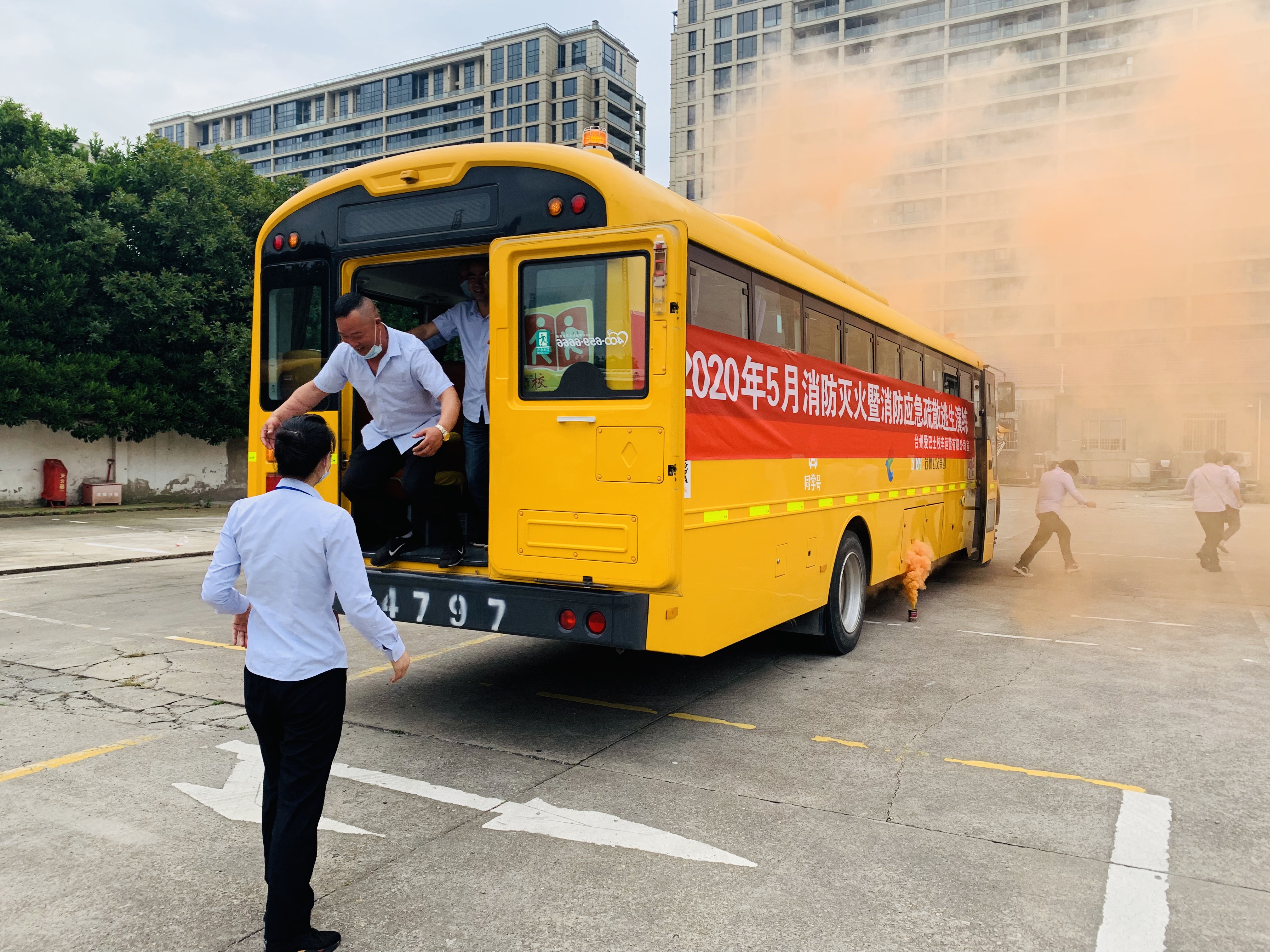 上午10时,应急疏散逃生演练正式开始。一辆载有“学生”的校车在途中突然车身中部冒烟,驾驶员立即靠边停车,打开双闪灯并熄火。同时与照管员配合,打开校车前车门与应急门,组织乘车学生按照“前六后五”(车厢前面六排往前车门下车,后面五排往后从应急门下车)的疏散方式撤离至安全区域。而后驾驶员在车后50米处放置三角警示牌,拿起车上的灭火器对准冒烟部位进行灭火自救。灭火后第一时间向公司报告,公司立刻组织人员到现场查看并处理。本次演练采取火灾烟雾模拟,目的是通过演练进一步强化员工消防安全意识,提高应急自救互救与抢险疏散能力,紧急情况下熟悉扑救、救护及疏散逃生方法,强化司乘人员共同协作能力,提高应急处置能力,确保全车人员的生命安全。