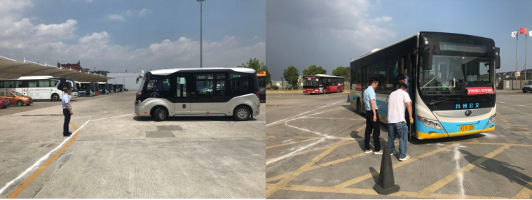 又联合绿管集团,赴巴士公司停车场进行实地打点放样,将图纸所示车位、转弯弧度、建(构)筑物等按1:1比例还原在测试场地上,并请驾驶人员驾驶同尺寸车辆进行实地模拟行驶,检验设计车位排布的合理性及与边线建筑物的允许安全距离,通过多轮分析模拟结果和听取驾驶人员的建议,不断校正、调试、测量、记录,并第一时间将模拟结果反馈给方案设计单位,为下一步设计图纸优化提供有效支撑,确保项目落地后既能降低驾驶人员操作难度,又能使乘客无障碍快速上下车,力争做到人车分离、“一步到位”。