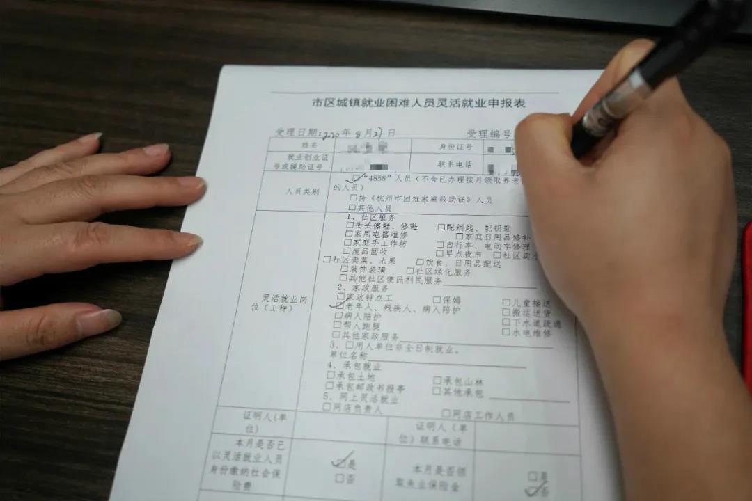 ▲城镇就业困难人员填写《“灵活就业补助”申请表》并通过审批后,方可领取“灵活就业补助款”