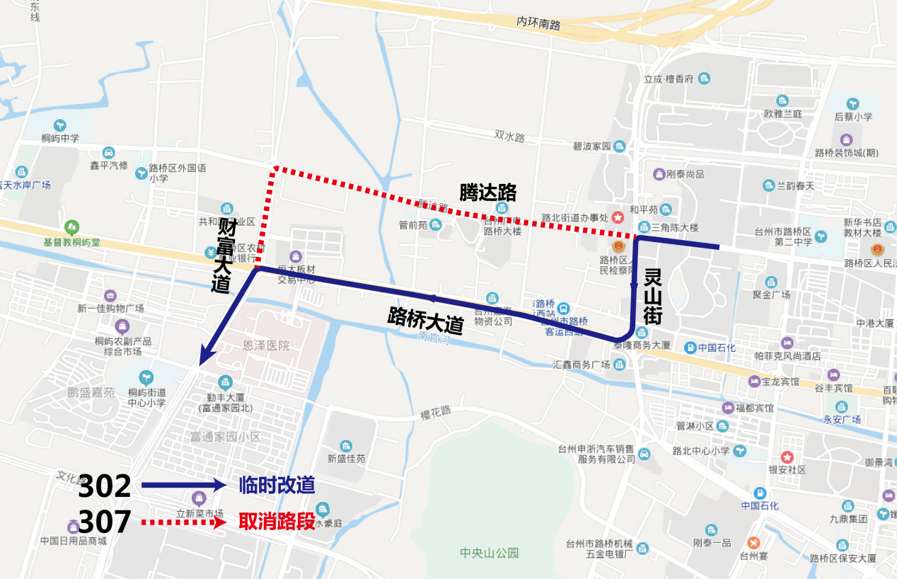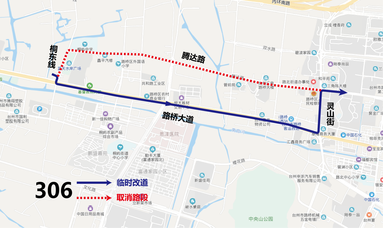 调整走向为腾达路-灵山街-路桥大道-财富大道,临时改道期间取消停靠路北街道、图书馆、高桥章村三对公交站点,新增停靠园丁苑、路桥短途西站、朱家管前三对公交站点。