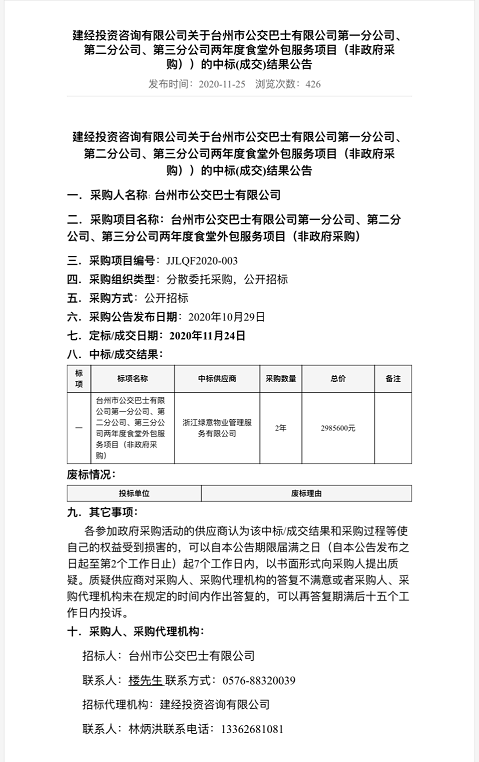建经投资咨询有限公司关于台州市公交巴士有限公司第一分公司、第二分公司、第三分公司两年度食堂外包服务项目(非政府采购))的中标(成交)结果公告