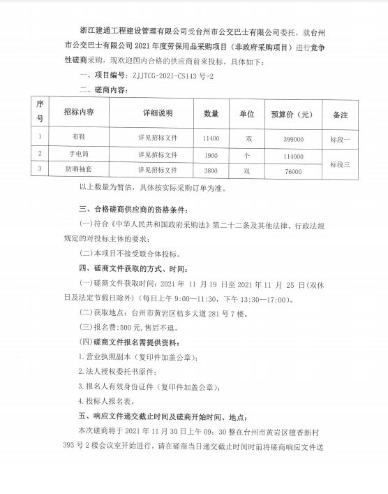 台州市公交巴士有限公司2021年度劳保用品采购项目(非政府采购项目)的竞争性磋商公告(二)