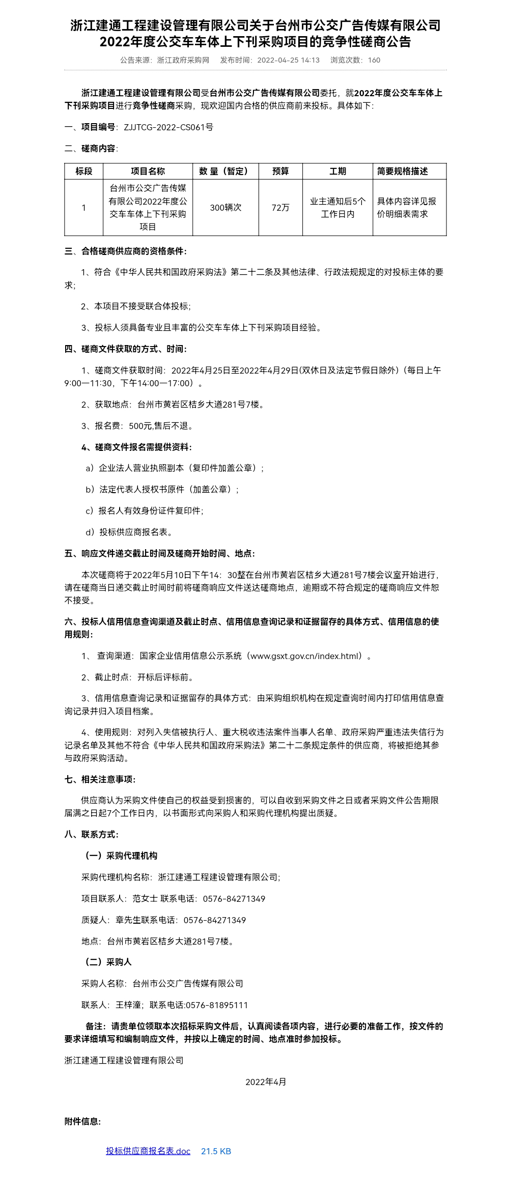 浙江建通工程建设管理有限公司关于台州市公交广告传媒有限公司2022年度公交车车体上下刊采购项目的竞争性磋商公告