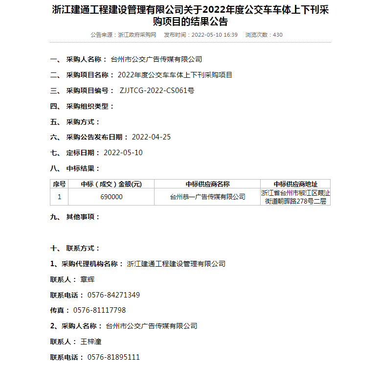 浙江建通工程建设管理有限公司关于2022年度公交车车体上下刊采购项目的结果公告