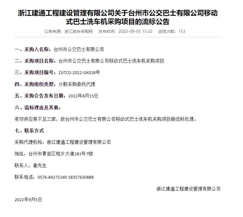 浙江建通工程建设管理有限公司关于台州市公交巴士有限公司移动式巴士洗车机采购项目的流标公告