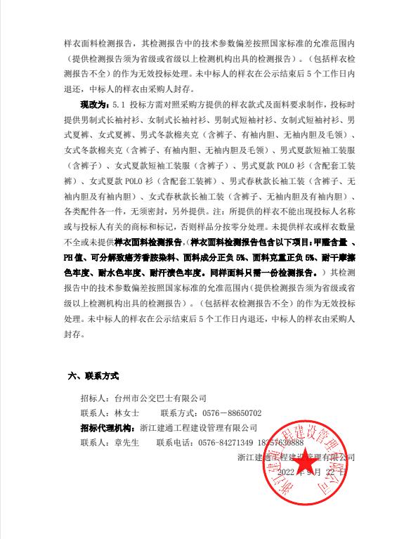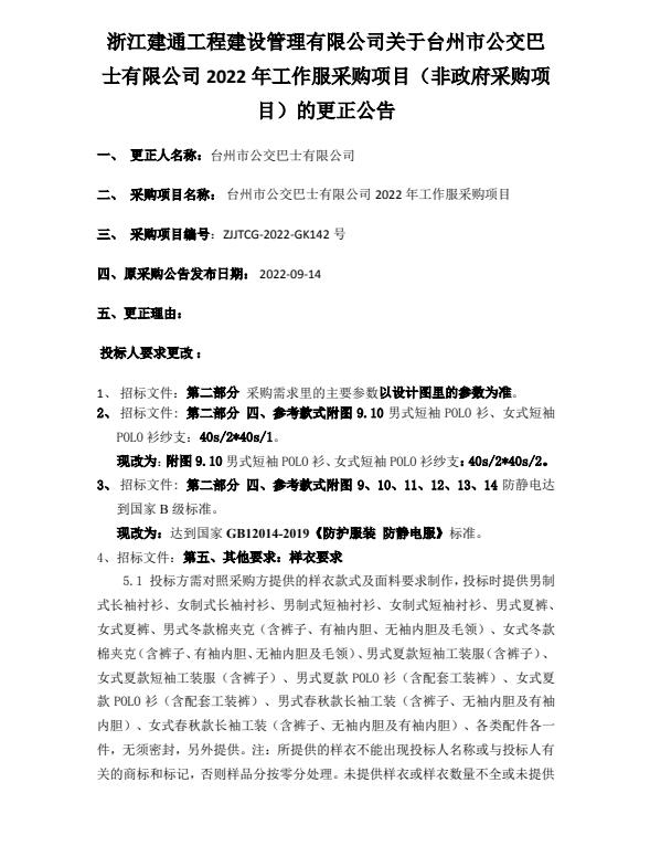 台州市公交巴士有限公司2022年工作服采购项目更正公告