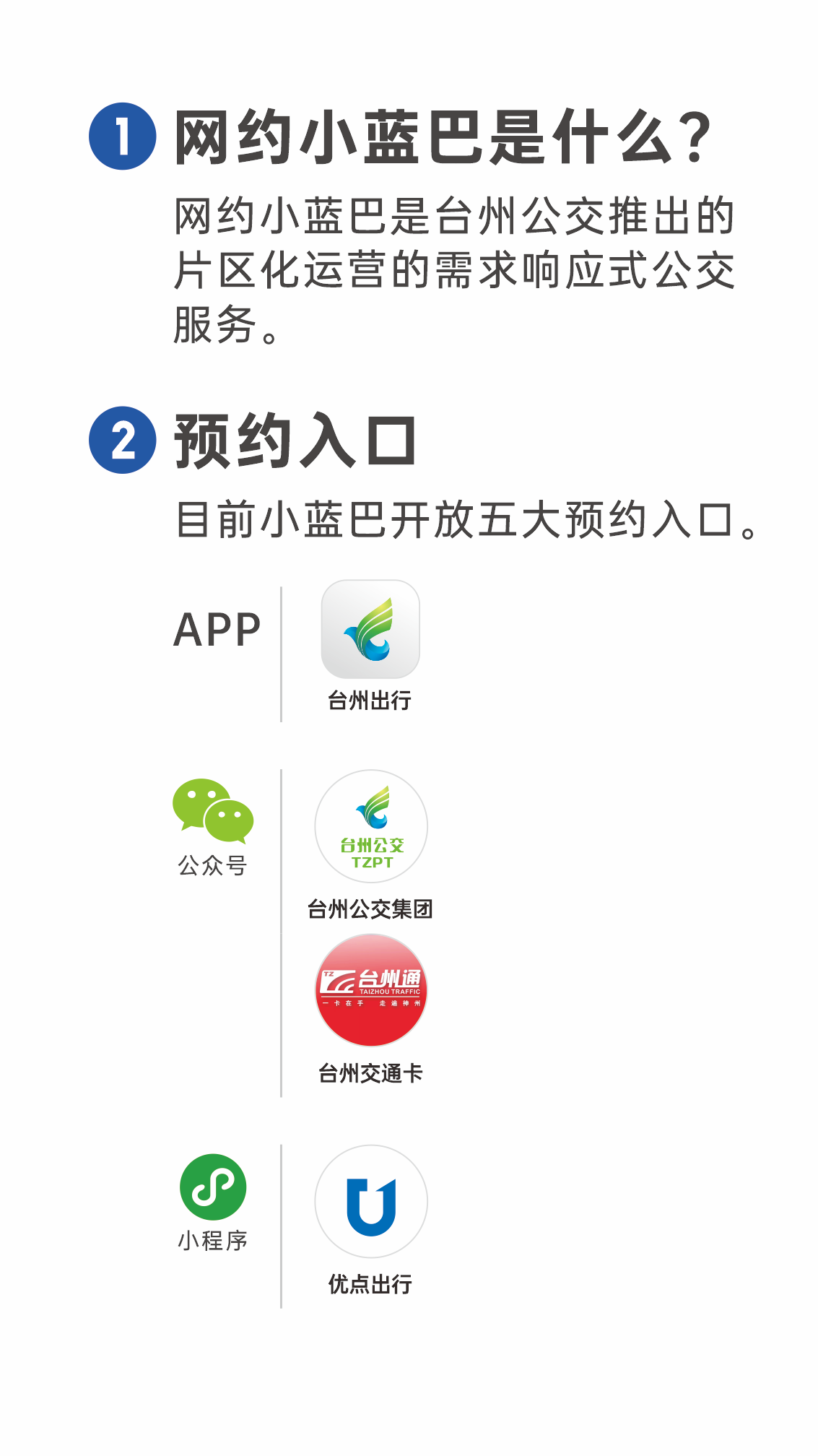市民可通过台州出行App主页 “小蓝巴”;av解说 、台州交通卡微信公众号服务菜单“小蓝巴”;优点出行微信小程序“动态公交”等入口进入动态公交平台在线实时预约乘坐。也可以扫描站牌上的站台码或在跟司机确认车辆顺路后使用补票码乘坐“网约小蓝巴”。