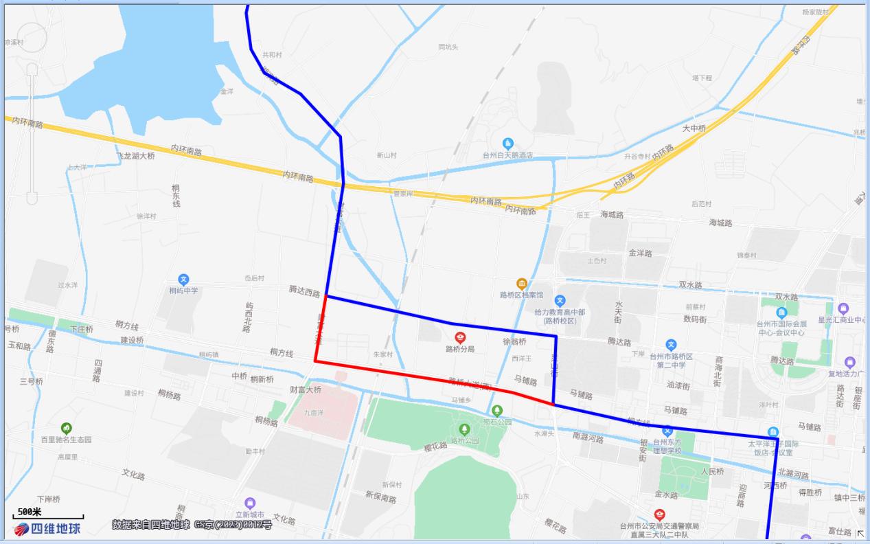 受路桥区腾达路(桐东线-徐翁泾段)综合改造提升工程封闭施工影响,自2023年12月25日起至2024年5月31日止,途经该路段的304路、306路、307路、311路、913路等五条公交线路将采取临时改道措施。具体方案如下: