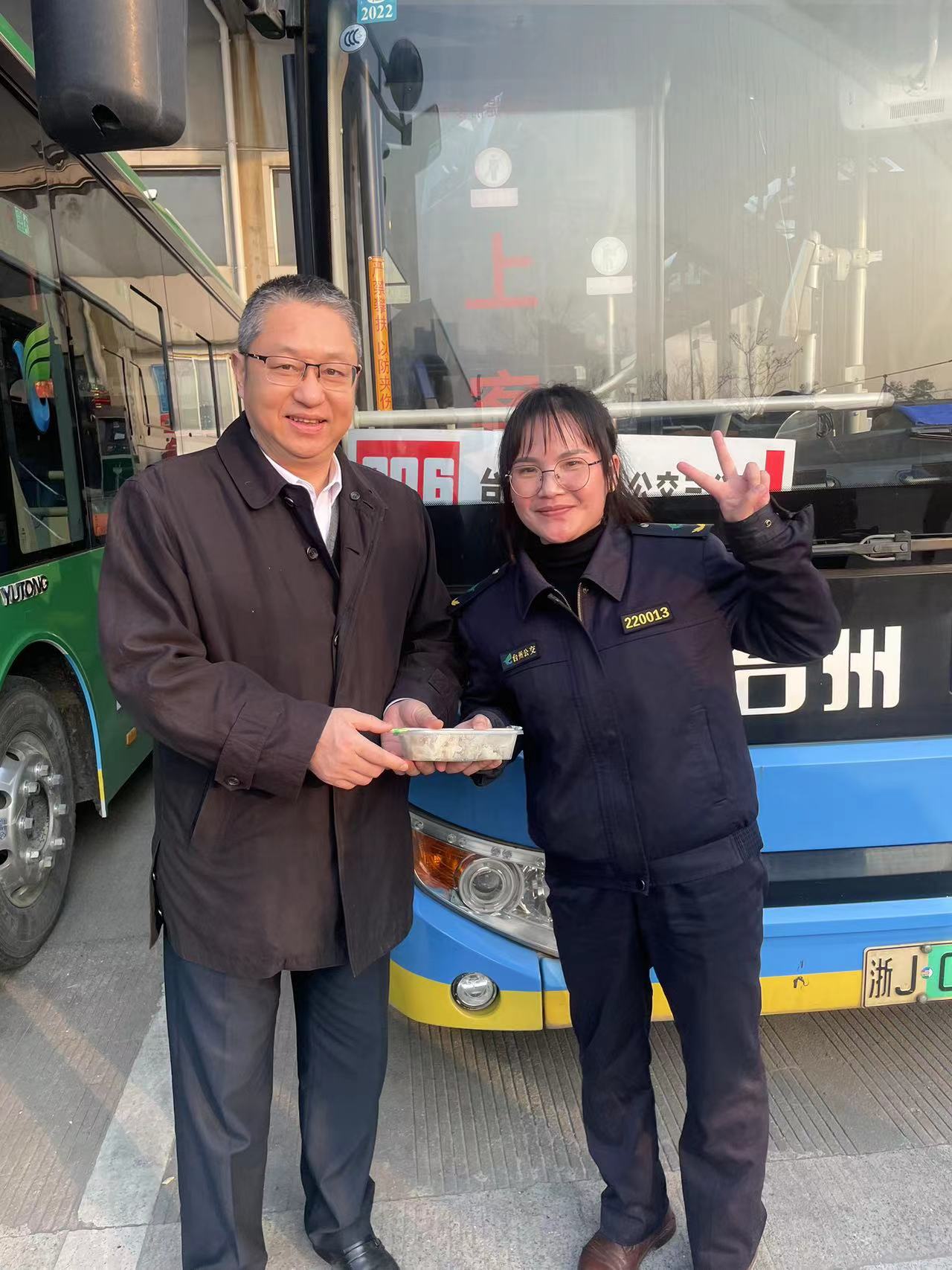 “祝大家新年快乐,先吃点饺子垫垫肚子,等下年夜饭就送到了。”韩克华一行来到路桥一车队场站关切地询问驾驶员的节日工作安排和家庭过节情况,对他们“舍小家,为大家”的高尚情操和敬业精神表示赞赏,对大家为公交高质量发展作出的无私奉献表示感谢!希望坚守岗位期间保持良好的精神状态,提供准时准点的优质服务,要合理安排好休息,同家人们过一个幸福的节日。
