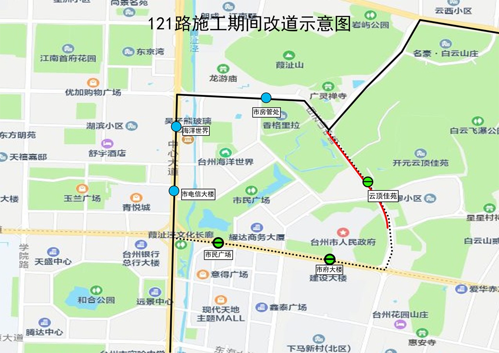 一、121路调整由岩屿南路往西经白云山中路至中心大道接原线路。期间取消云顶佳苑、市府大楼、市民广场站,经停市房管处、海洋世界、市电信大楼站。