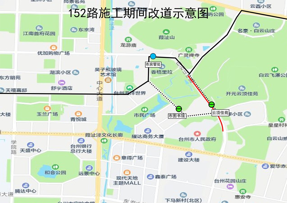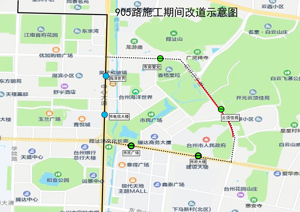 根据椒江白云山路城市停车及基础设施提升工程改造施工需要,因白云山中路(岩屿南路至市府大道段)于1月11号至12号进行全封闭施工,期间途经施工路段的公交线路作如下改道调整: