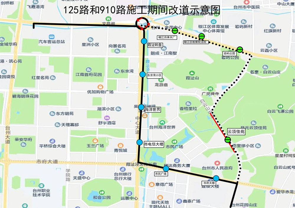 四、125路和910路调整由黄海公路经中心大道、市府大道接原线路。期间取消椒江自来水厂、椒江区检察院法院、岩屿公园、云顶佳苑站,经停葭沚转盘、东京湾小区、海洋世界、市电信大楼、市民广场、市府大楼站。