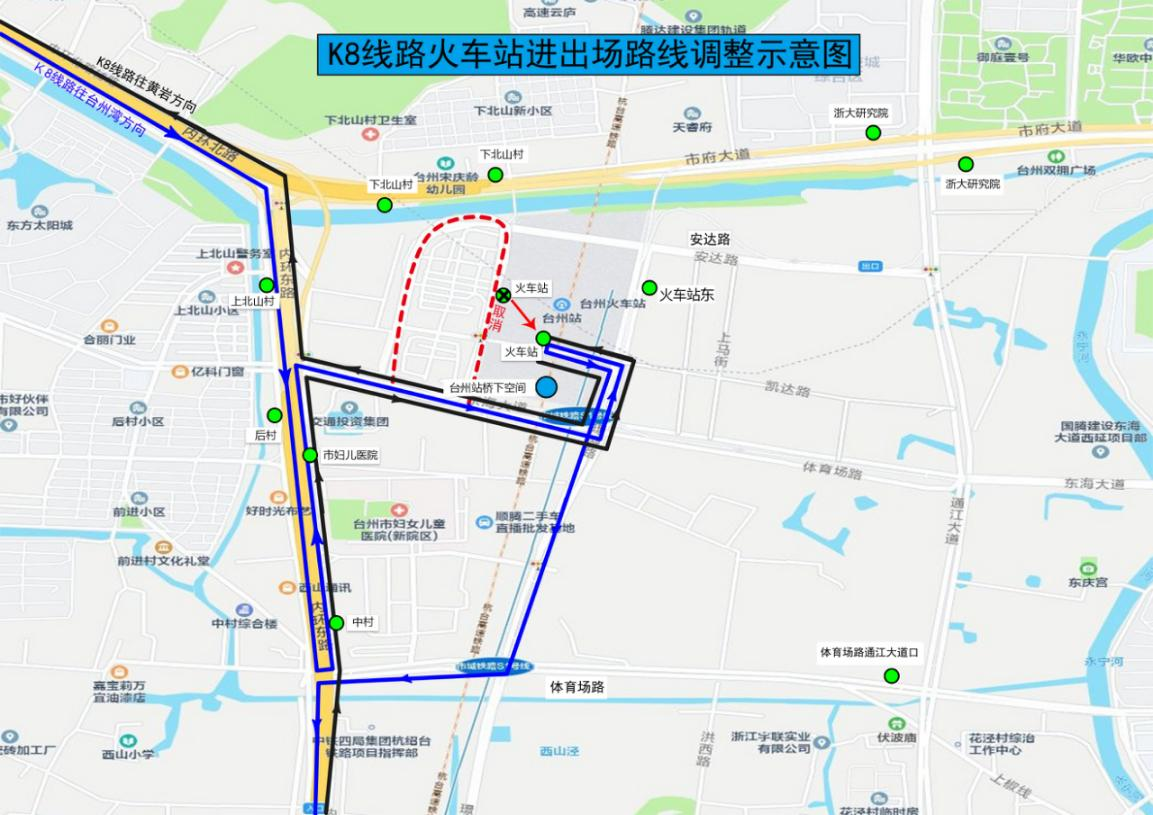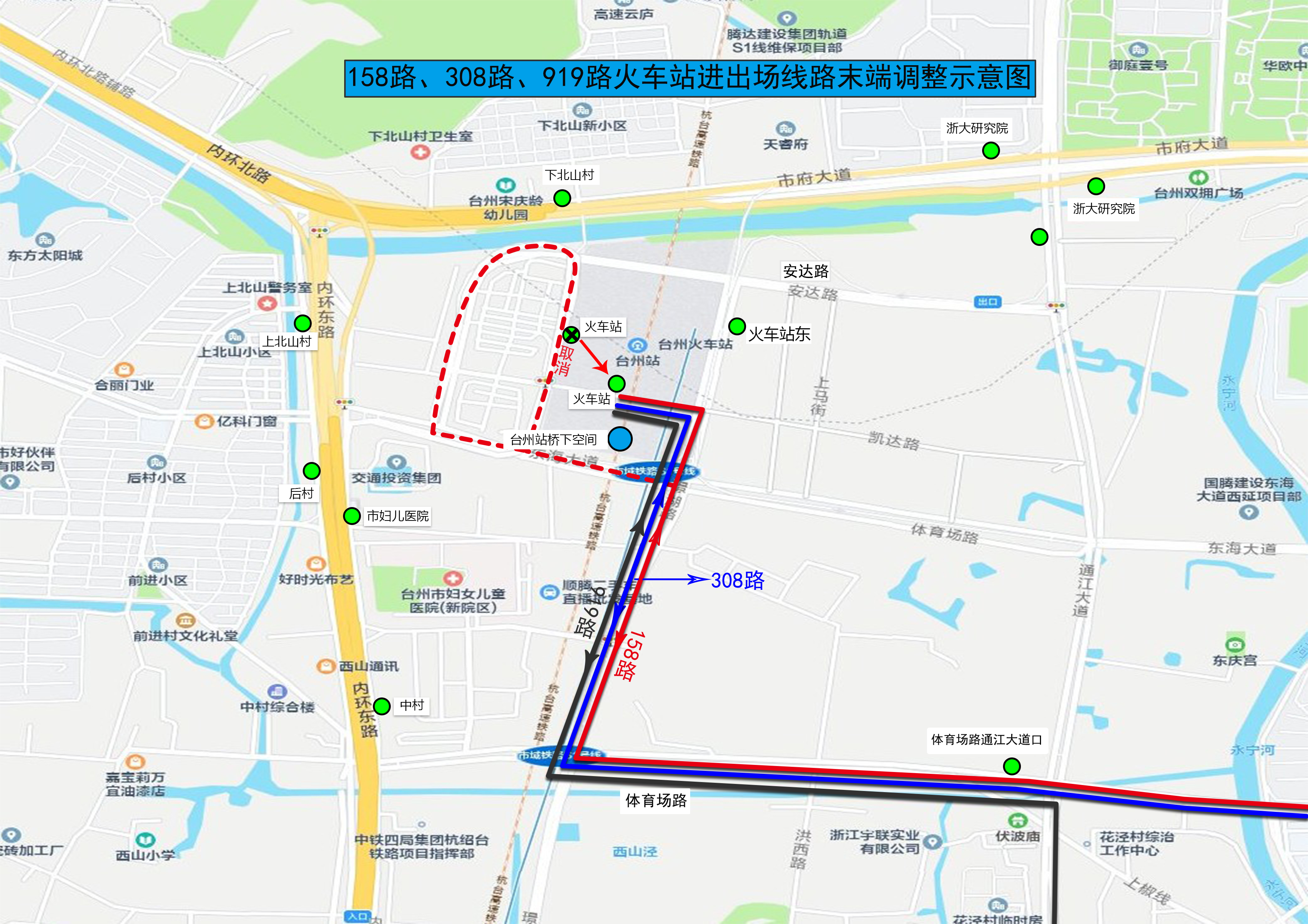 调整由体育场路、璟湖路进入台州火车站公交枢纽站新场站。
