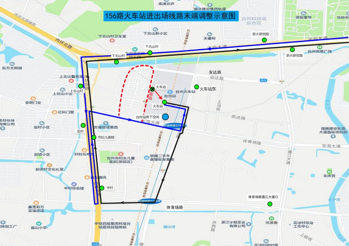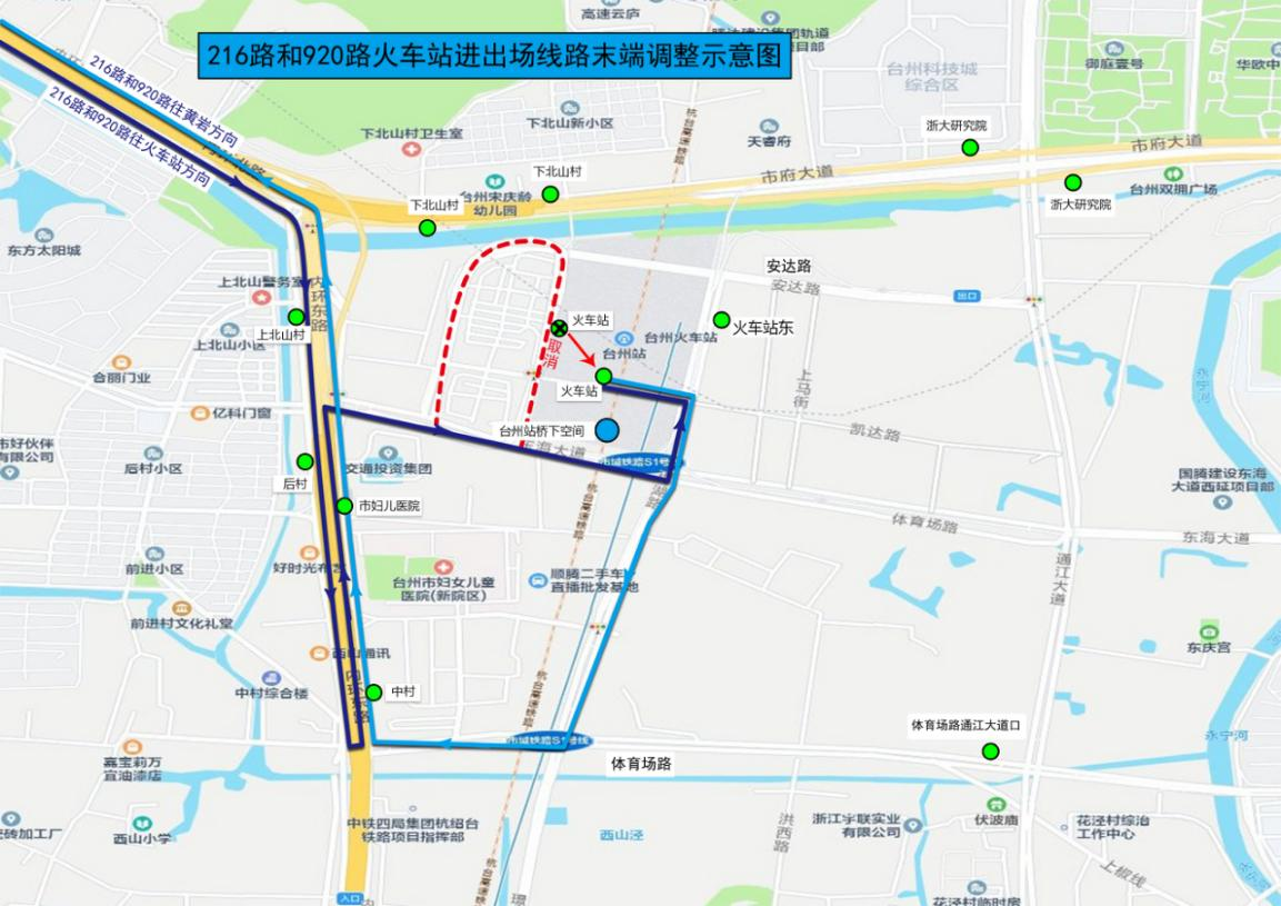 调整由通江大道经安达路、璟湖路进入台州火车站公交枢纽站新场站,同步增设火车站东双向停靠站。
