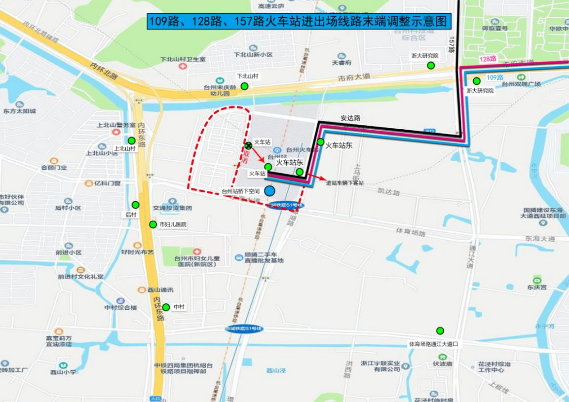 台州火车站公交首末站(火车站站房西侧)将于2025年1月22日搬迁至台州火车站公交枢纽站(火车站站房南侧)。为配合场站搬迁,109路、128路、156路、157路、158路、216路、308路、919路、920路、K8路等10条公交线路首末站将同步调整至新场站,线路末端走向及站点调整如下: