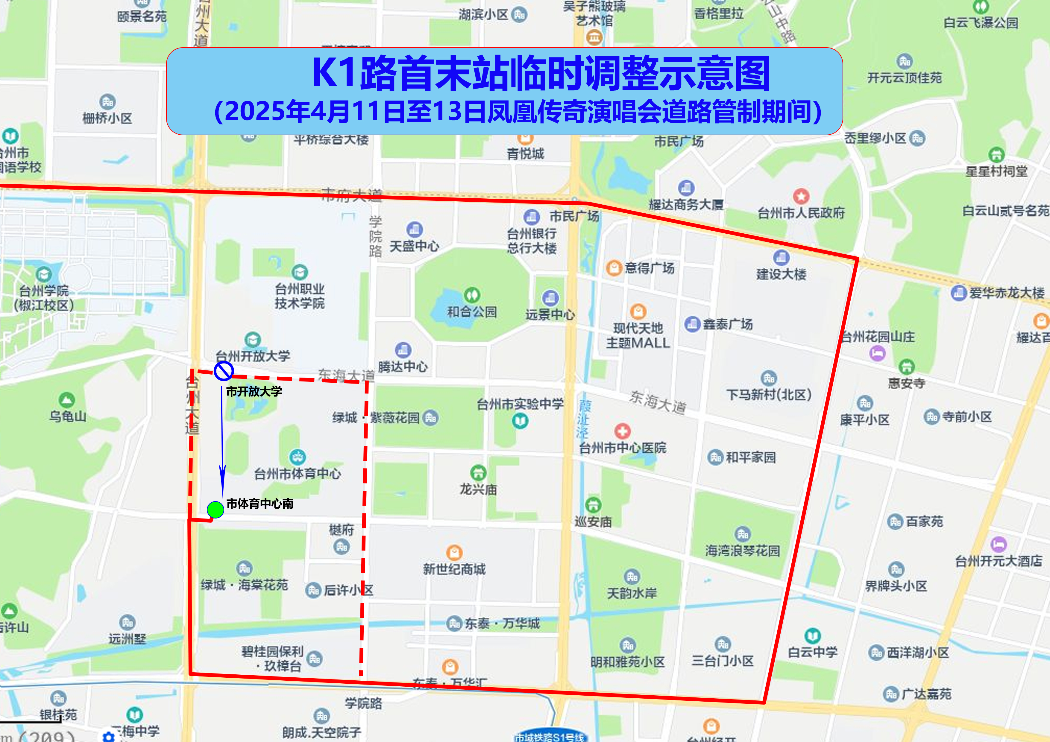 由原开放大学首末站调整至市体育中心南发班。请广大乘客们至市体育中心南公交场站候车。