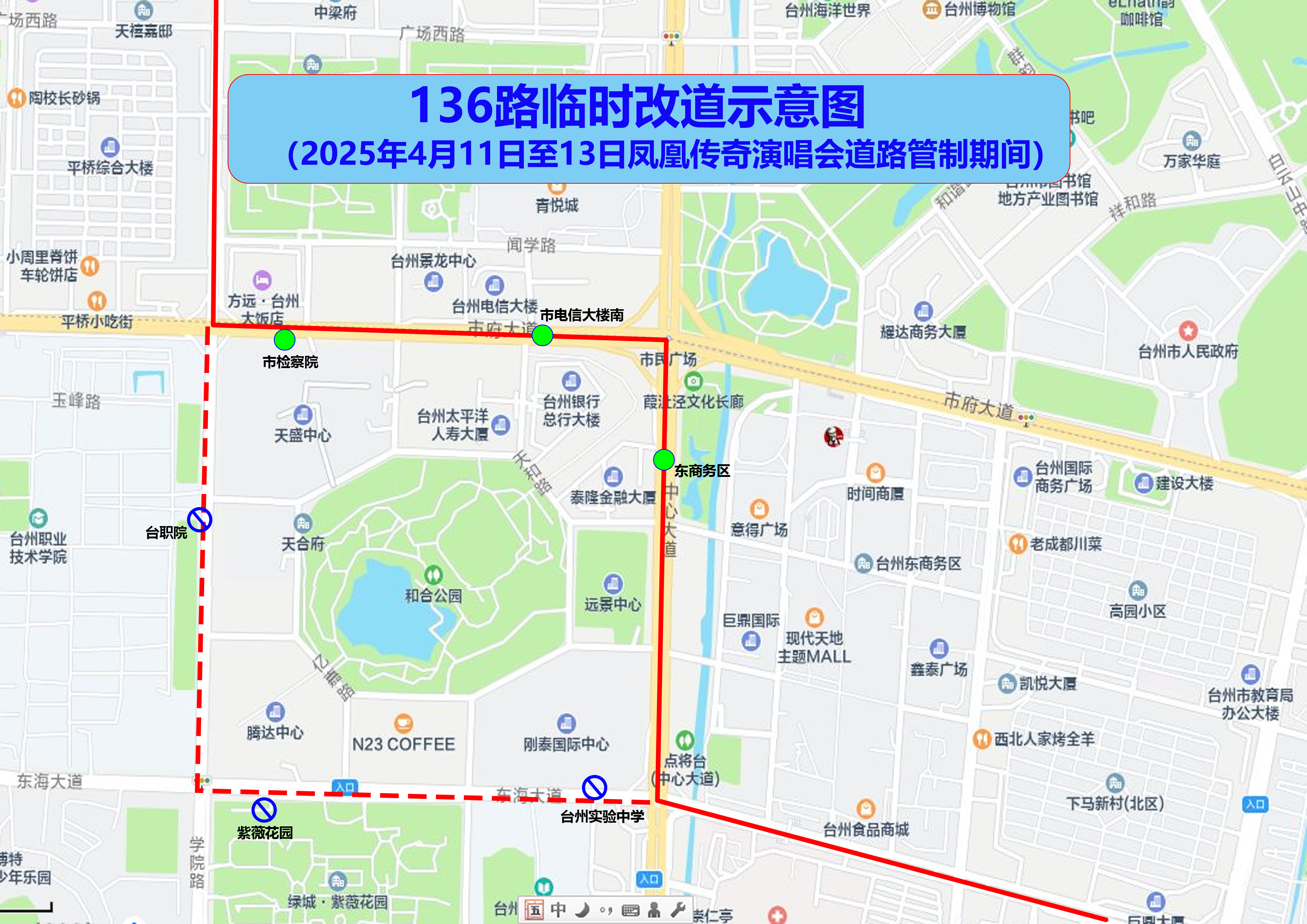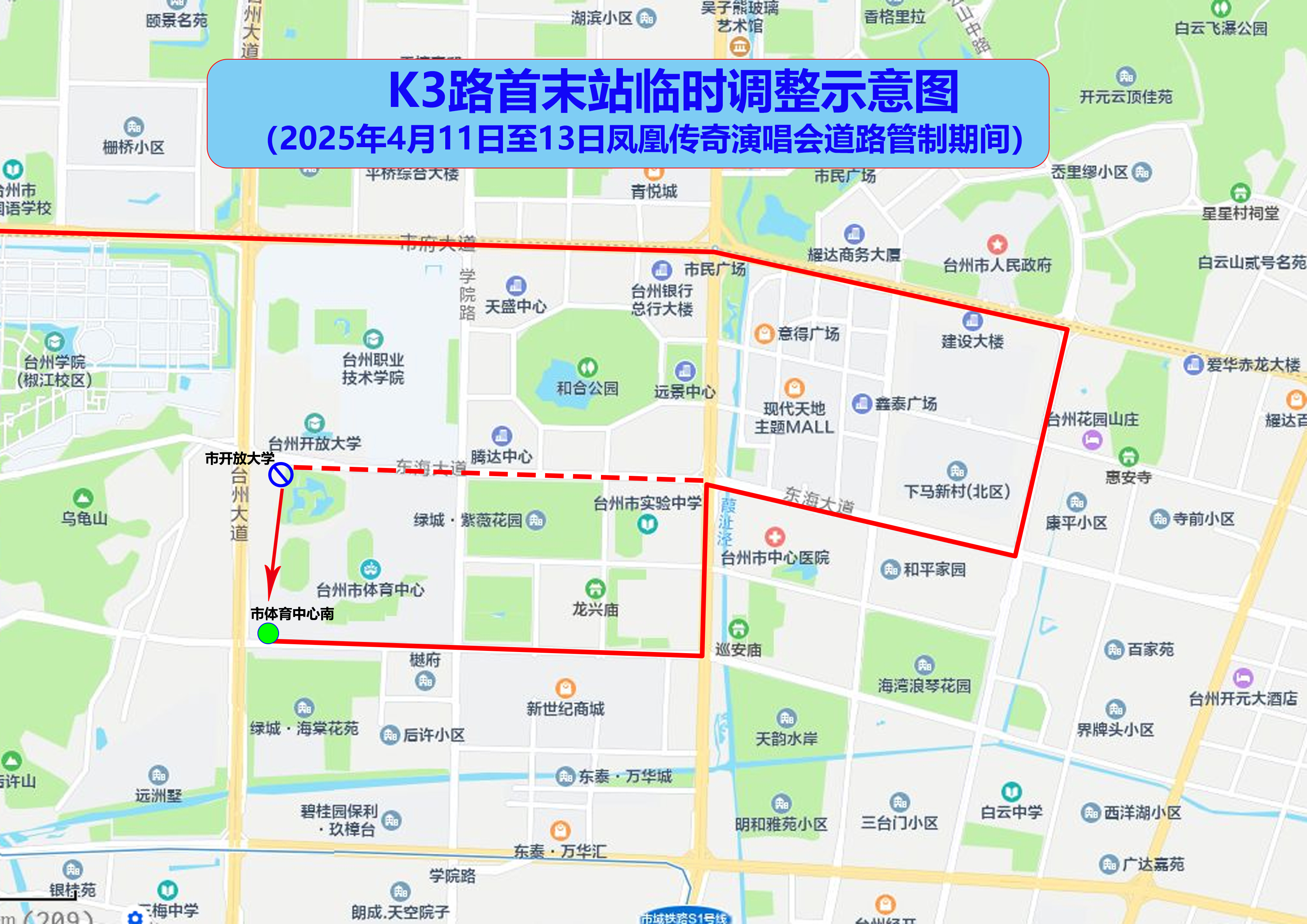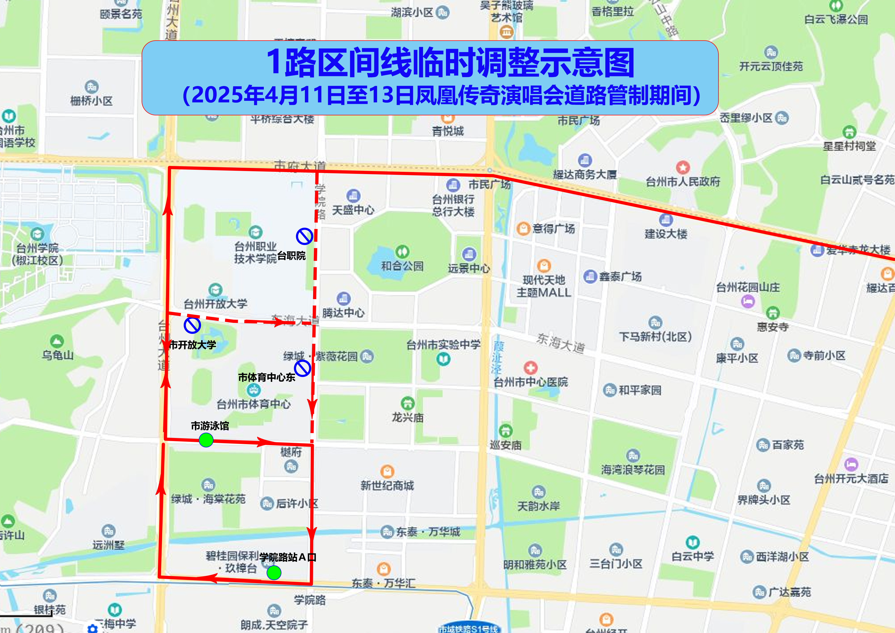 局部调整由台州大道、体育场路、学院路、开发大道、台州大道单向循环接原线路。取消台职院、市体育中心东、市开放大学站点,启用市游泳馆站点。