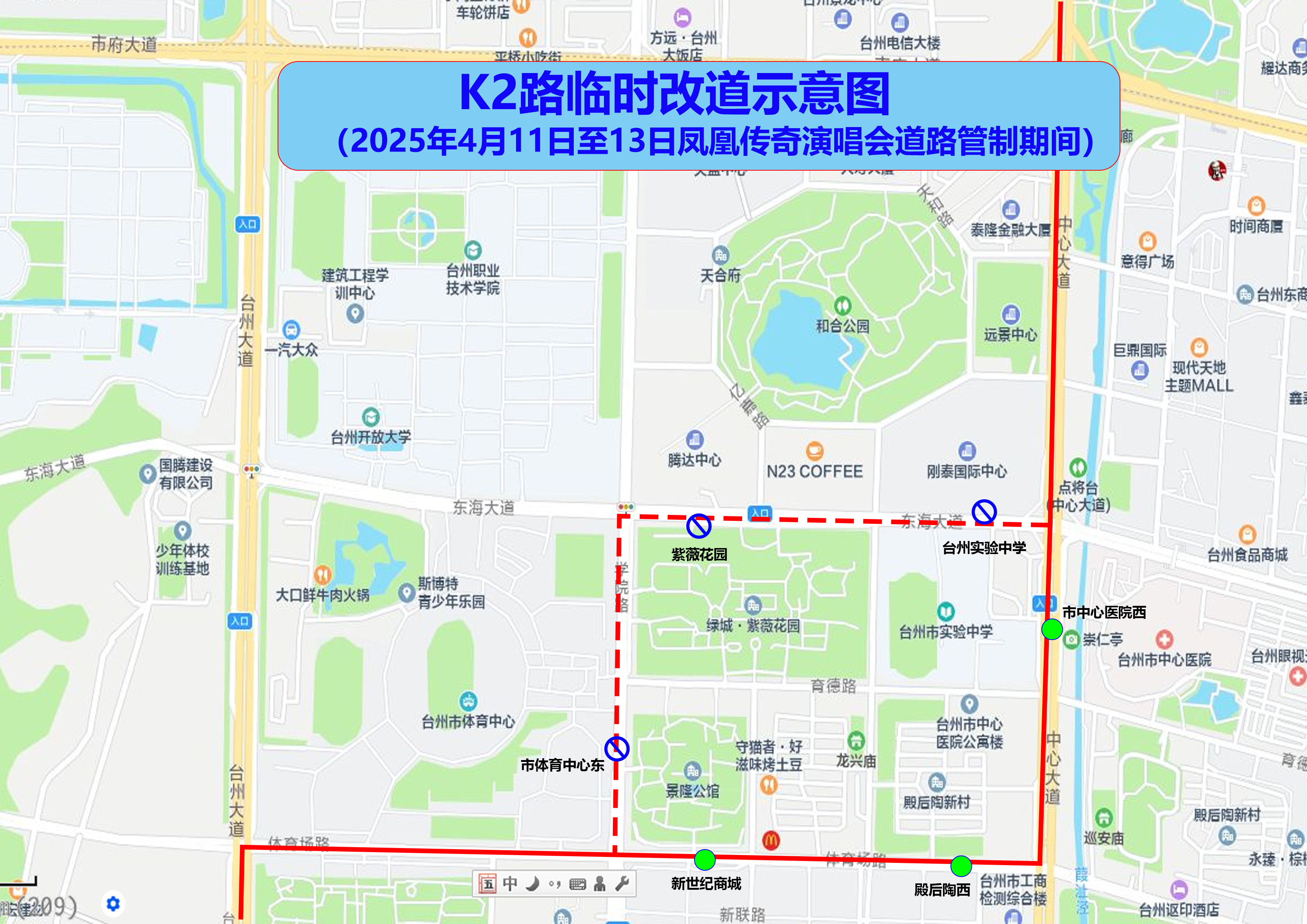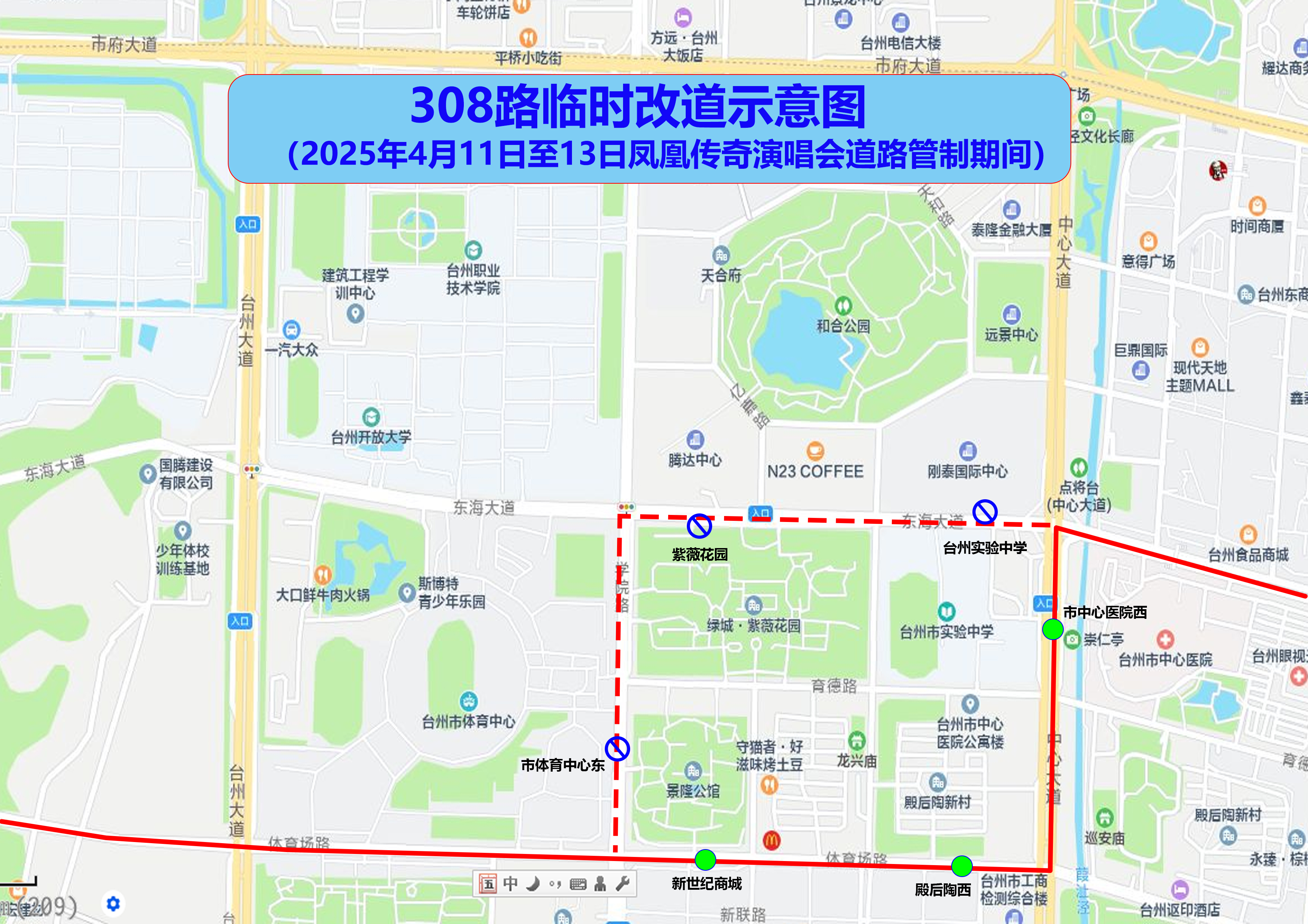 局部调整经中心大道接体育场路原线路。取消市体育中心东、紫薇花园、台州实验中学站点,启用新世纪商城、殿后陶西、市中心医院西站点。
