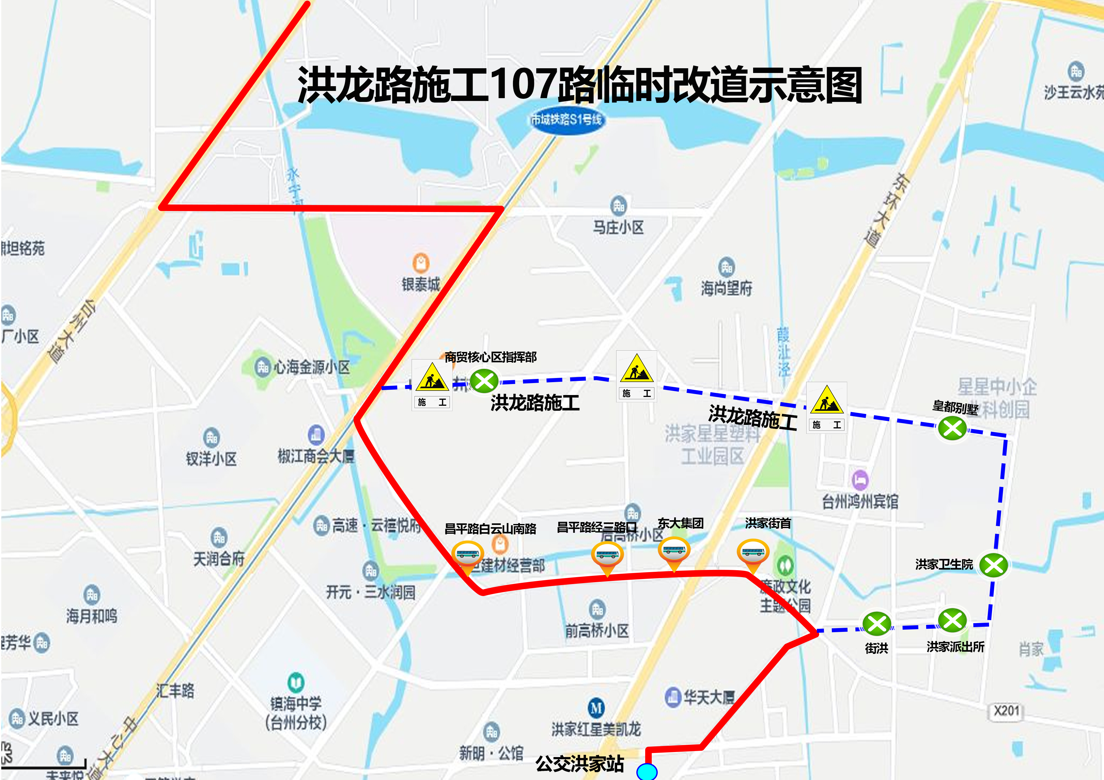 为配合洪龙路(星星集团塑胶园区北门-新村路)全封闭施工需要,自2025年6月1日起调整107路由中心大道经昌平路至公交洪家站,不再途经洪家立交桥、仓河路、洪三路。