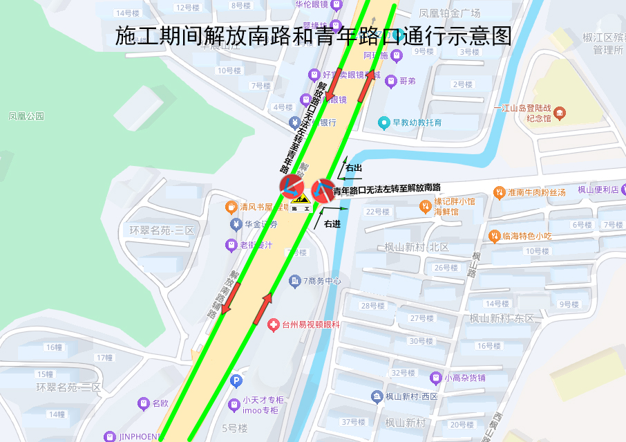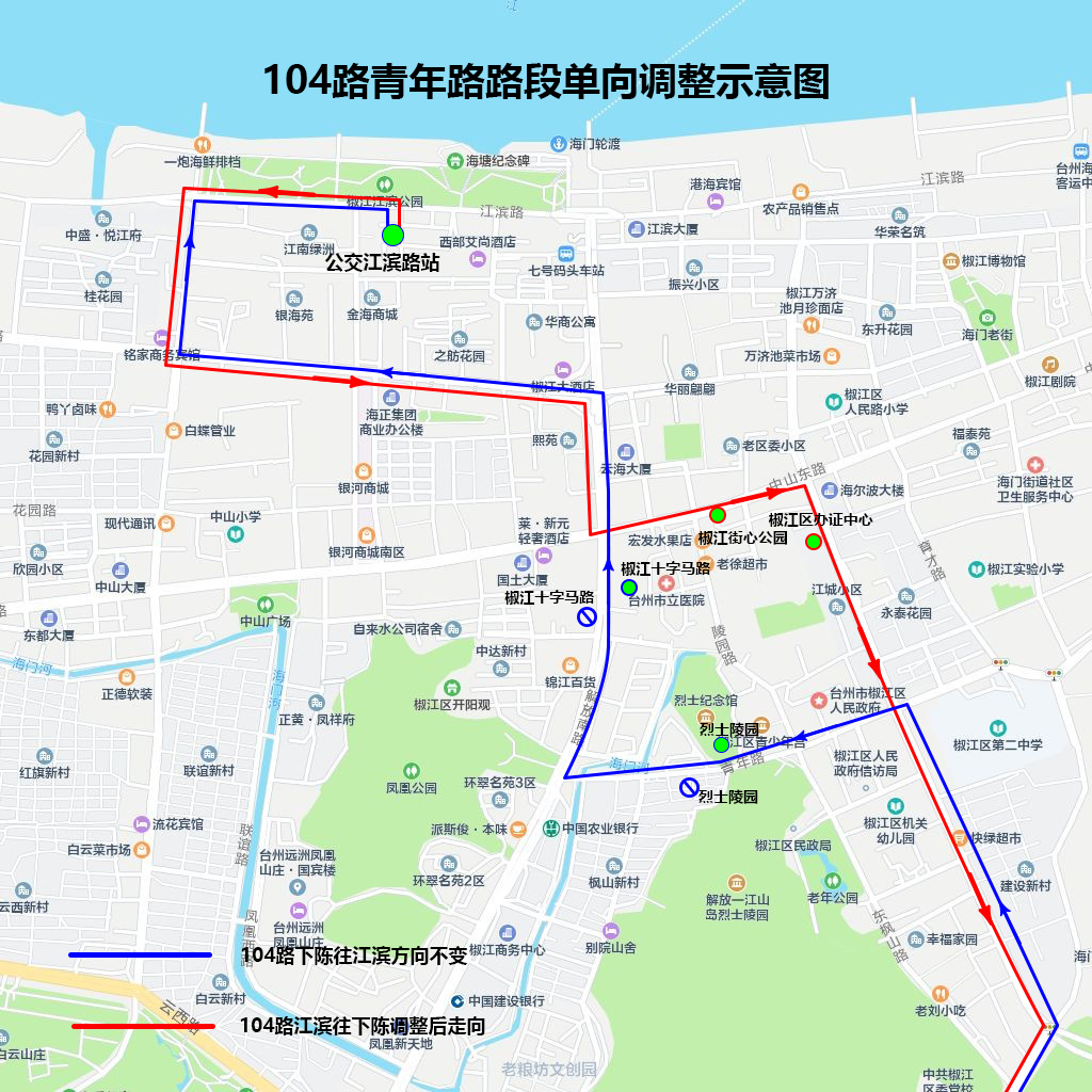 江滨站往下陈方向:调整由解放北路经中山东路至建设路接原线路(不经过青年路)。临时取消十字马路(路西侧)、烈士陵园(路南侧)站点,增设椒江街心公园(路南侧)、椒江区办证中心(路西侧)站点。