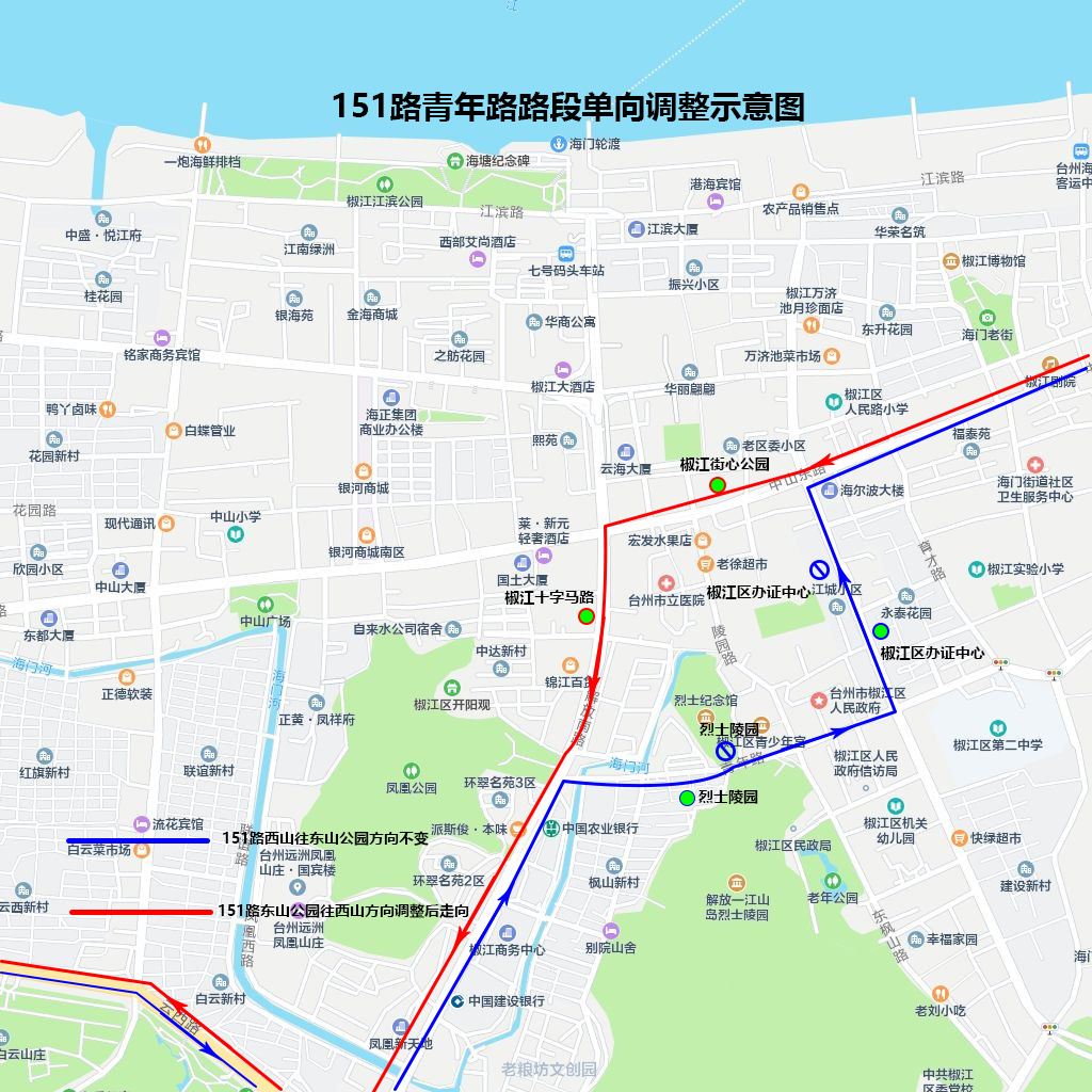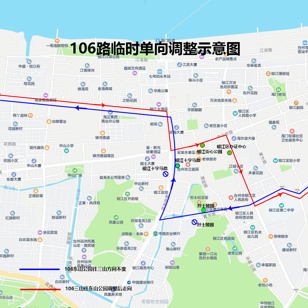 三山往东山公园方向:调整由解放北路经中山东路、建设路接原线路,临时取消十字马路(路西侧)、烈士陵园(路南侧)站点,增设椒江街心公园(路南侧)、椒江区办证中心(路西侧)站点。