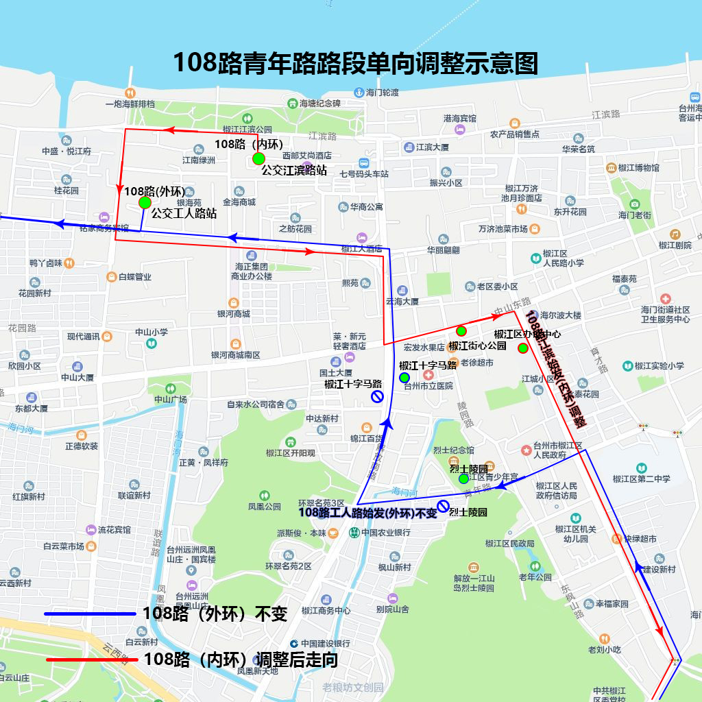 江滨路始发(内环):调整由解放北路经中山东路至建设路接原线路,临时取消十字马路(路西侧)、烈士陵园(路南侧)站点,增设椒江街心公园(路南侧)、椒江区办证中心(路西侧)站点。
