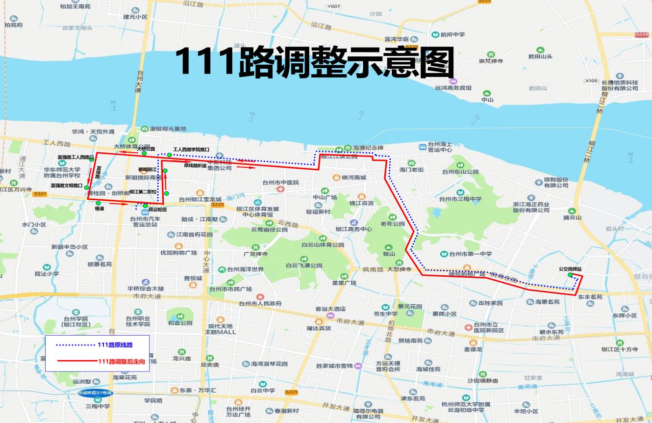 1.观江苑及周边小区乘客可在大桥公园站乘坐调整后的111路到葭沚枢纽,往市民广场、市中心医院方向可换乘136、510等线路;往椒江老城区及市立医院新院方向可换乘101、138等线路。