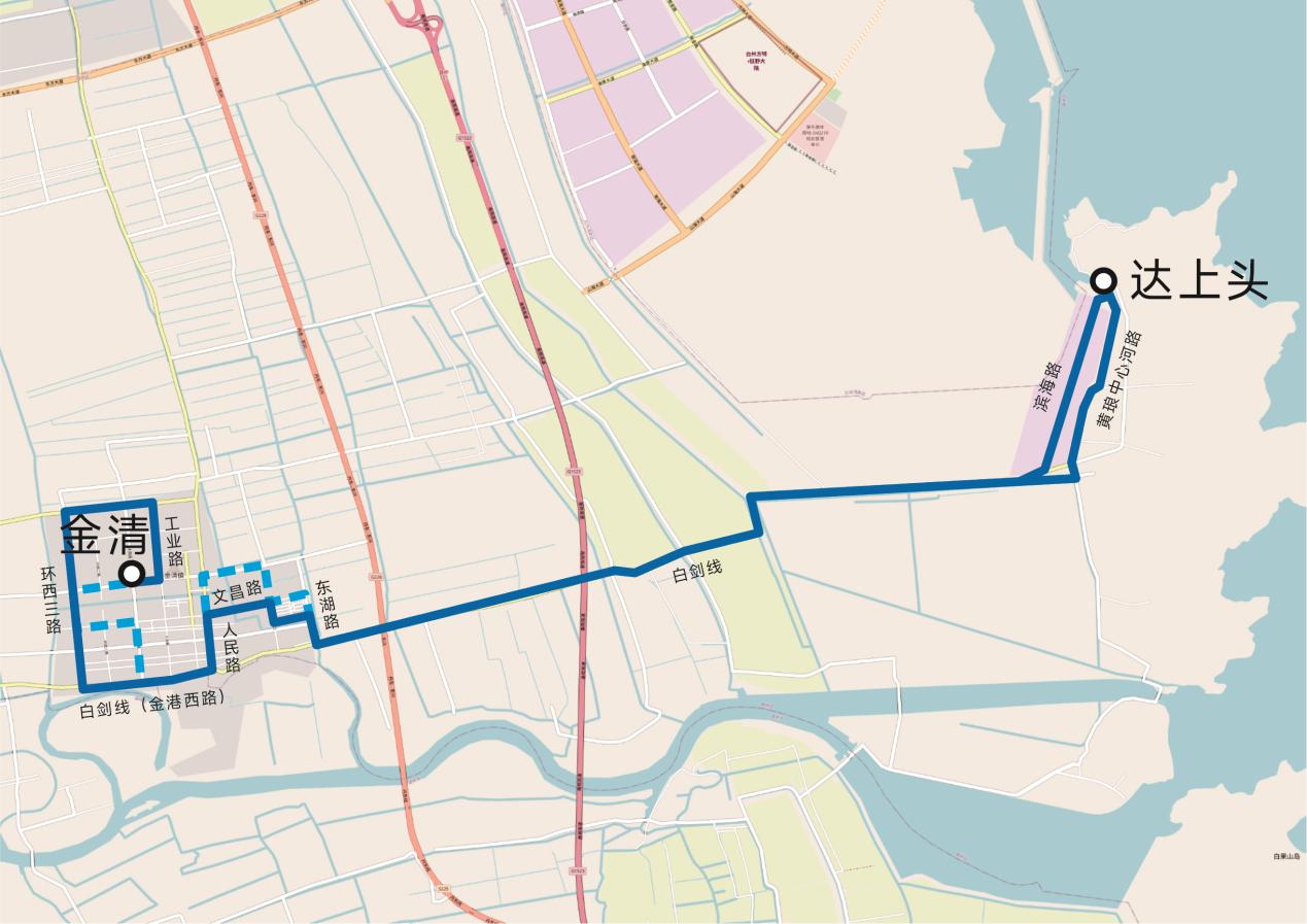 环西一路-金清大道-工业路-中心大道-环西三路-金港西路(白剑线)-人民路-文昌西路-文昌东路-粮库路-花园新村内部路-东湖路-白剑线-海滨路-黄琅中心河路。