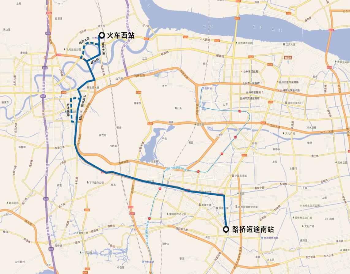 路桥短途南站-泰隆街-路桥大道(东)-路桥大道(西)-大环线-印山路-环城东路-东浦路-黄椒路-二环东路-联岛路-站西大道-火车西站。(不再经过劳动南路、站前大道)