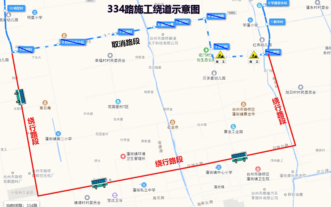 为配合花门村至大屋里道路封闭施工需要,即日起334路由中心街临时绕道环镇北路至椒金线(竿蓬首末站),不再途经005乡道。