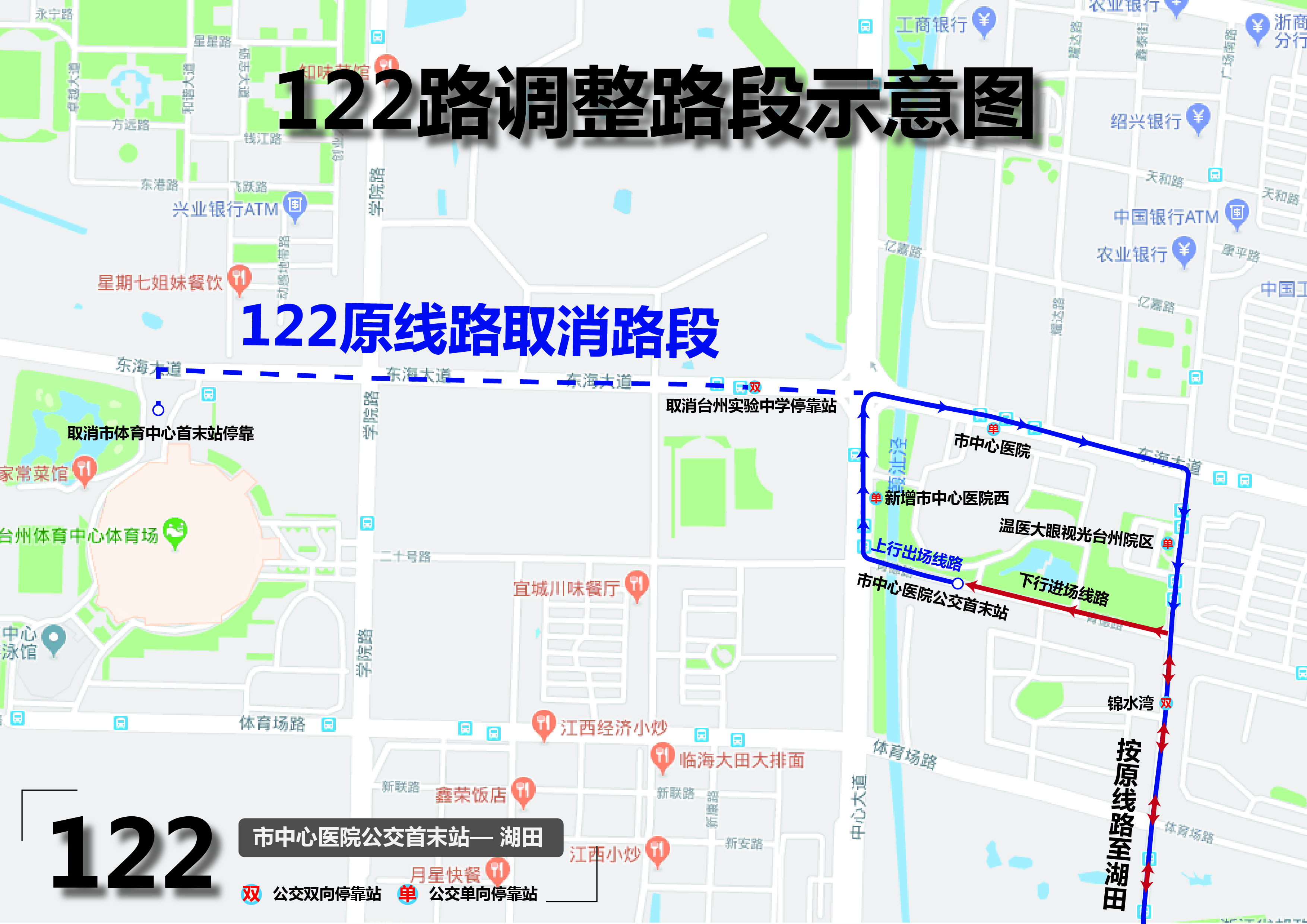 取消原市体育中心(首末站),台州实验中学(一对),温医大眼视光台州院区(单向)、市中心医院(单向)站点停靠。同时新增市中心医院西(单向)站点停靠。