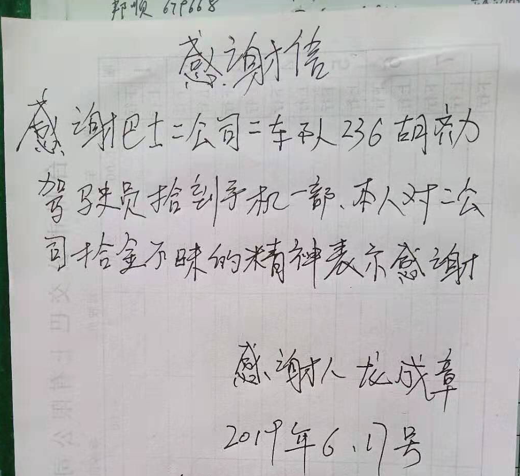 无独有偶,当天下午17点左右,驾驶员胡齐力师傅结束一天的运营回到场站进行例检,也发现了一位乘客丢失的手机。失主龙先生于下午18点左右到院桥车场领回遗失的手机时,驾驶员胡师傅已经下班。于是,龙先生特地写了一封感谢信留给驾驶员,对公司驾驶员良好的精神风貌和职业素养进行表扬。