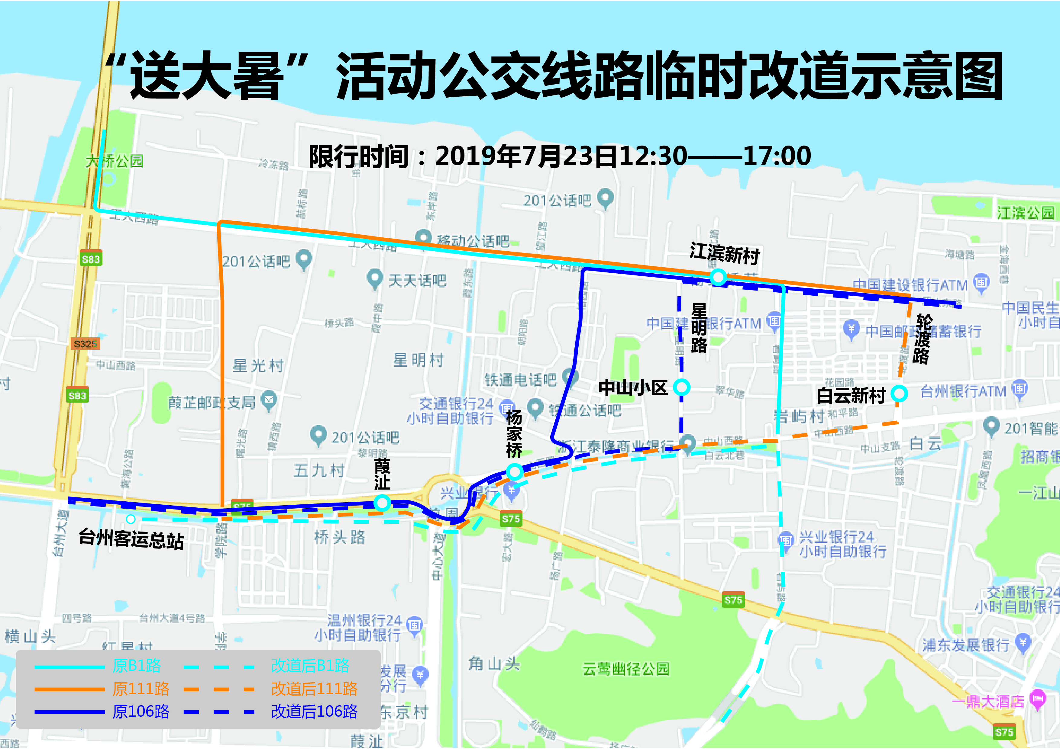 临时取消市中医院东、椒江第二实验小学、江滨新村、七八一六、干水产品市场、新世纪集团、葭沚后街、星光菜场、水产品交易中心、大桥公园渔家乐等站点,敬请乘客就近至中山西路、椒黄路沿线站点上下车