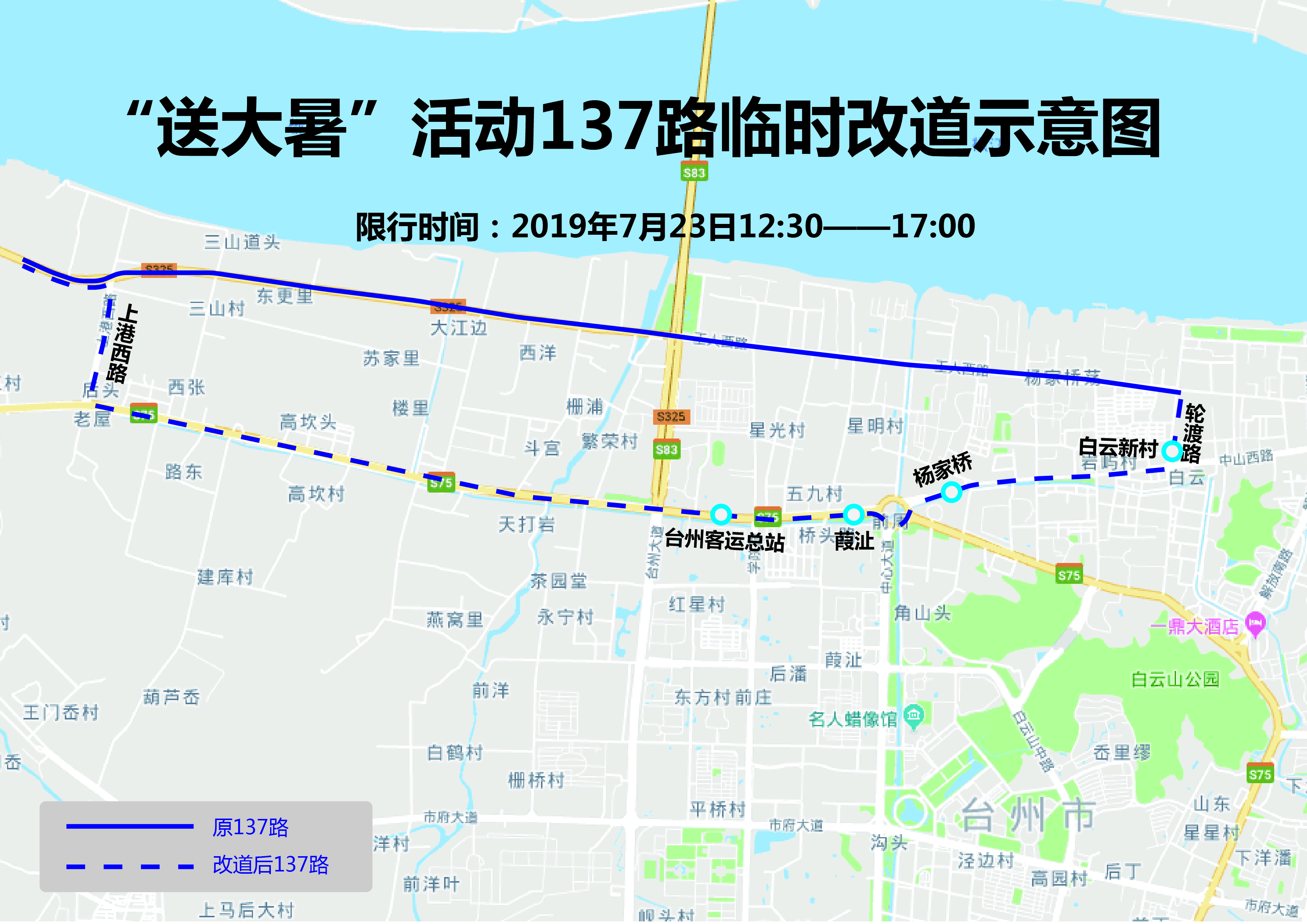 (1)137线路临时调整为椒江公交综合场站(始发)—原线路运行至工人西路(公交公司)-轮渡路-中山西路-上港西路-原线路至台州火车站