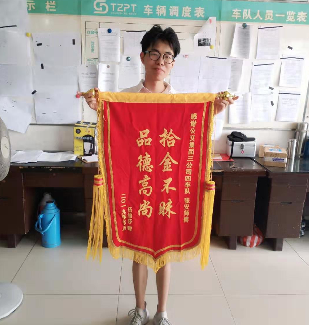 7月31日上午,巴士公司三分公司四车队调度室进来了一位笑容满面的年轻人,手上捧着一面“拾金不昧 品德高尚”的锦旗,说是要来感谢驾驶员张安拾金不昧的精神。