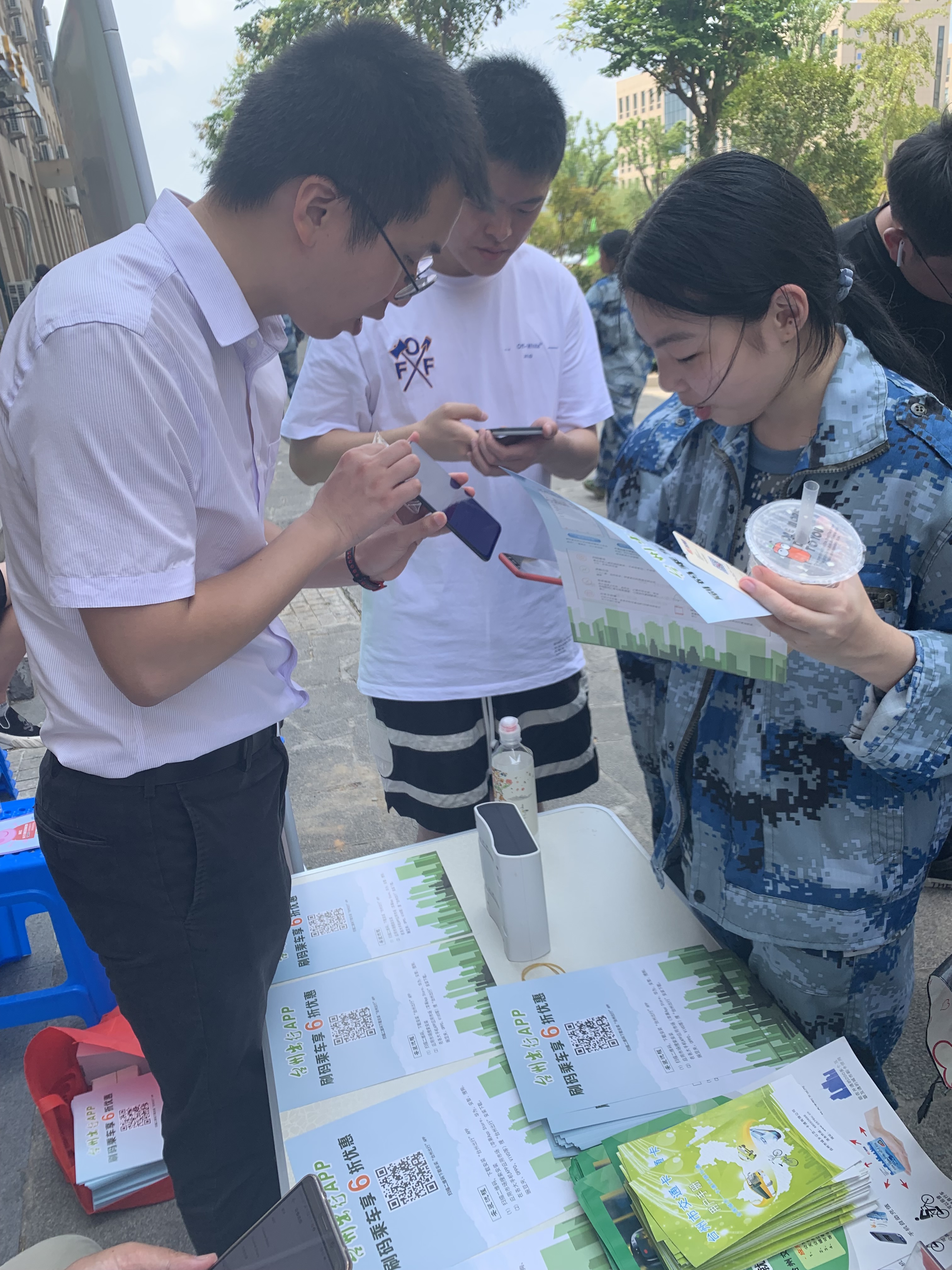 活动现场,刚开学的新同学对“台州出行”手机APP表现出浓厚的兴趣。工作人员向学校师生发放“台州出行”手机APP及一卡通宣传手册,宣传“台州出行”手机APP的优惠活动和功能,帮助同学们现场安装、注册、开通APP虚拟卡。当他们发现公交卡还能在自己的家乡使用时,纷纷表示使用公交卡越来越便捷,再结合自己实际需求进行办理充值。