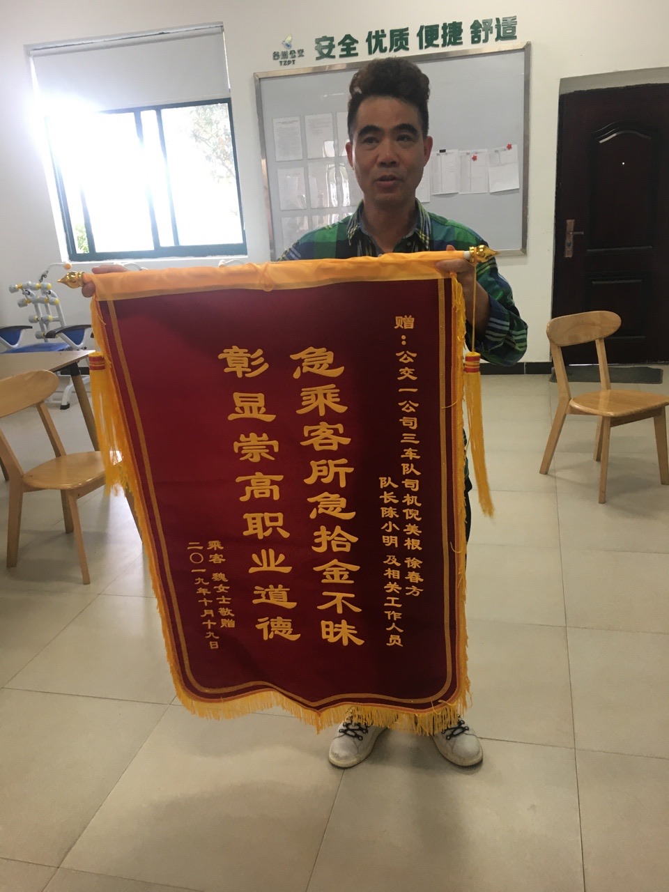 10月22日,巴士公司一公司三车队收到了乘客徐女士赠予的一面锦旗,上面写着“急乘客之所急,彰显崇高职业道德”。