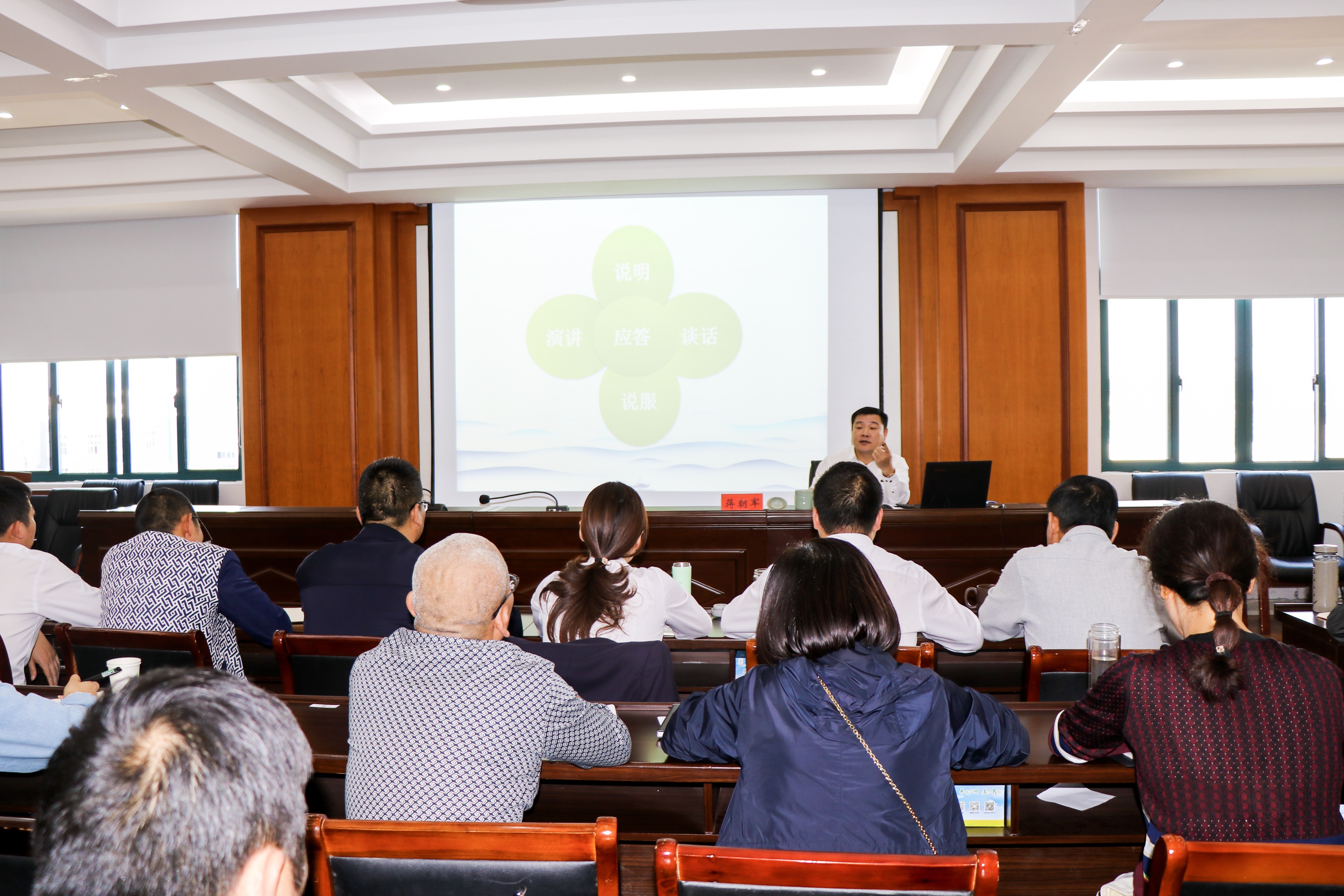 讲座中,蒋朝军书记旁征博引,用深入浅出的解读方法带领大家走进领导者语言表达的世界,体验到话语表达艺术的美丽,对如何提高自身演讲水平提出建议和方法。同时,他结合诙谐有趣的例子阐述了领导言语表达艺术对塑造干部形象的重要性,展示了语言对于思维的重要关系,还就演讲的目的、克服演讲障碍、演讲的语言组织、构建演讲格局、演讲常见模板、演讲的语言和形象等内容层层剖析,作出生动细致的讲解。