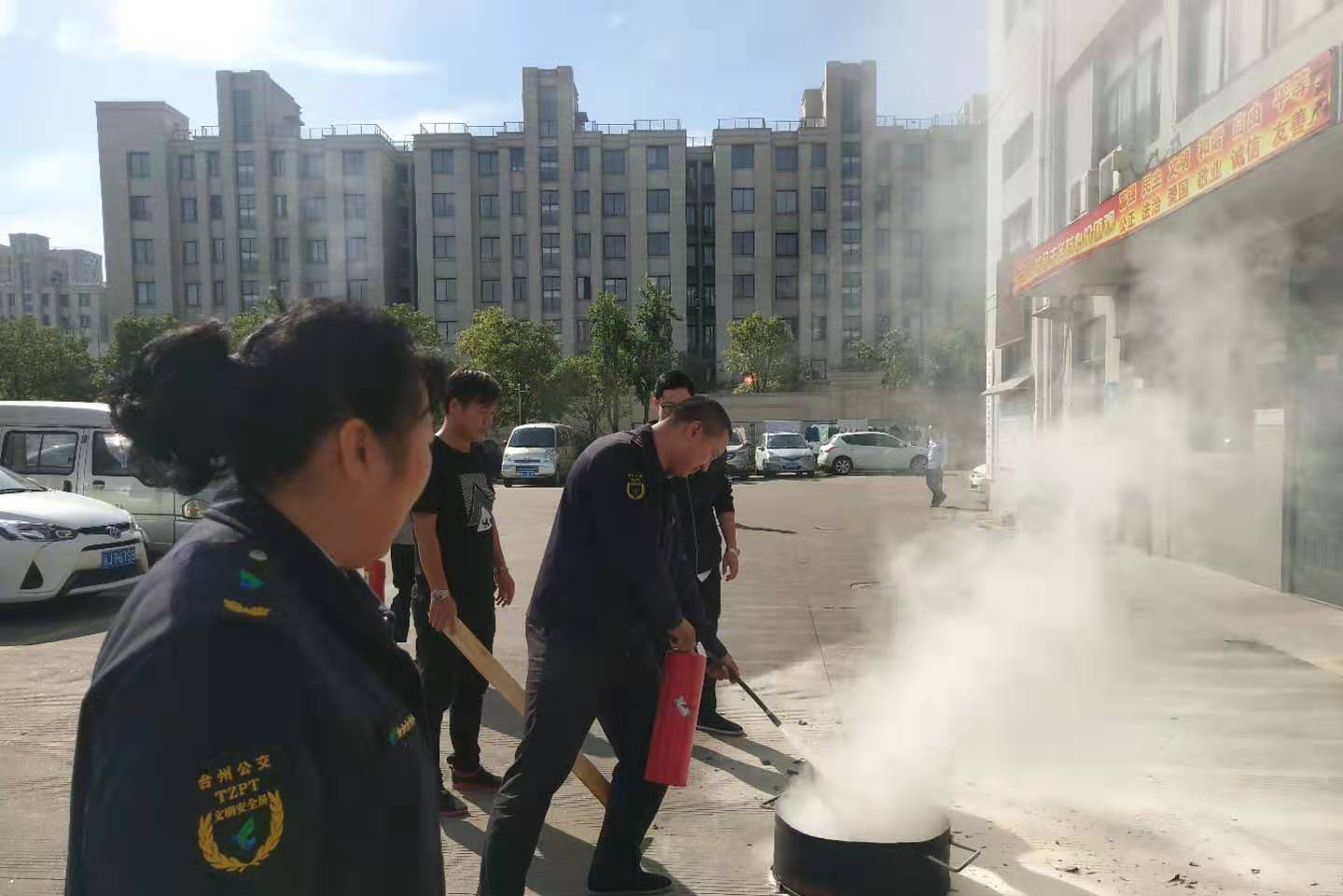 在一车队客运总站演练现场,保安人员在场站内地面发现一处火源燃物。车队管理人员第一时间组织人员疏散,将人员疏散至安全空旷的上风口位置后,再迅速组织驾驶员使用干粉灭火器对火源处进行灭火扑救。灭火成功后,清点疏散人员人数及应急人员人数。