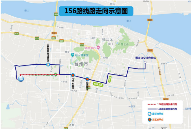 为了进一步方便台州市高铁新区(台州市妇女儿童医院)与椒江城区之间的公交出行需求,同时提升公交网线覆盖率。根据目前公交线网布局,对试运营后123B路(椒江江滨路公交首末站至台州妇女儿童医院)进行客流需求所向数据分析结合市民信息反馈。现将123B路公交线进行优化调整,优化调整后取消123B线路名,新增至156路线路名,将于近期开通试运营。