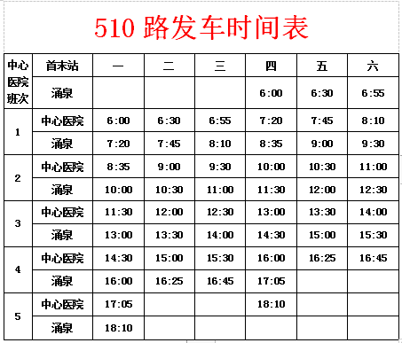 为更加方便涌泉镇沿线群众的出行需求,12月26日起,510路(涌泉镇—台州市中心医院)增加至6辆车运行,每日运行增加6个班次,候车时间从原来的40分钟缩短至25-30分钟。