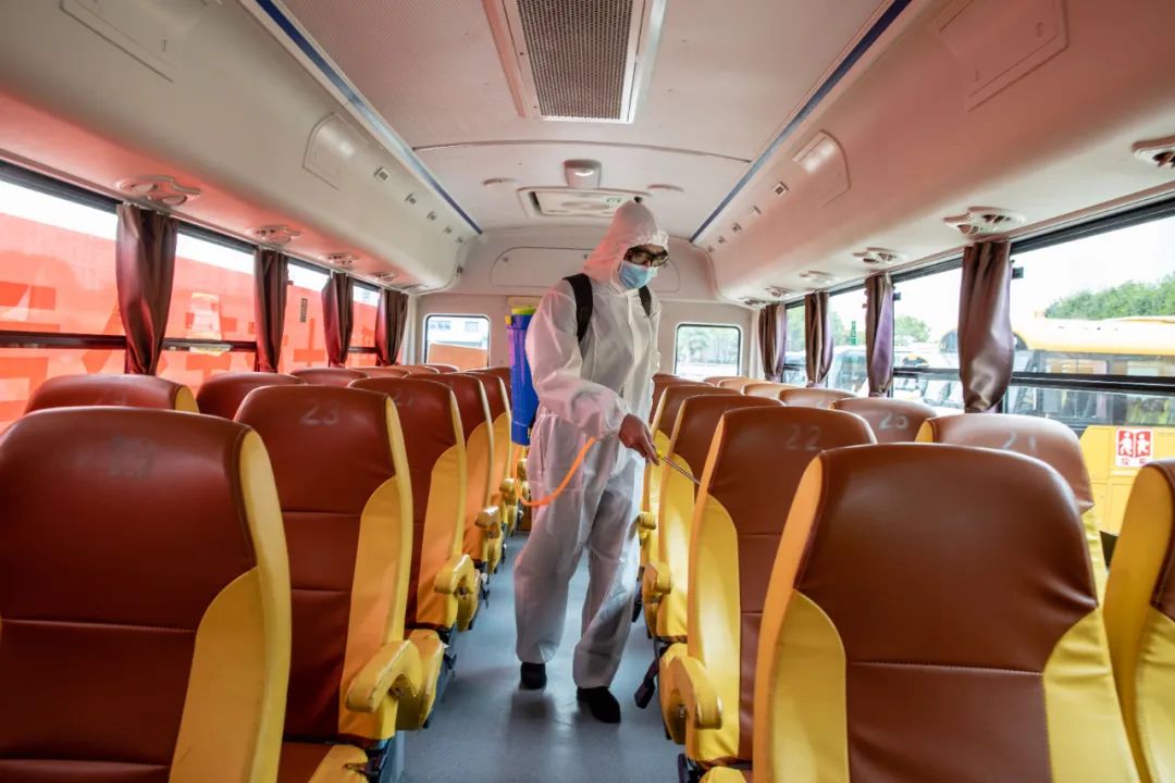 校车上配备了额温枪、口罩、免洗手消毒液、等防护物资。“学生乘车时全程佩戴口罩,一旦有学生忘记携带,我们会免费提供一次性口罩应急。”蔡国君介绍说,开学后,校车内外每天都会进行全面消毒,针对学生易接触的座椅扶手、安全带卡扣等部位将进行重点消毒;在班次运行时或回场后,也会要求打开车窗通风换气,避免感染。
